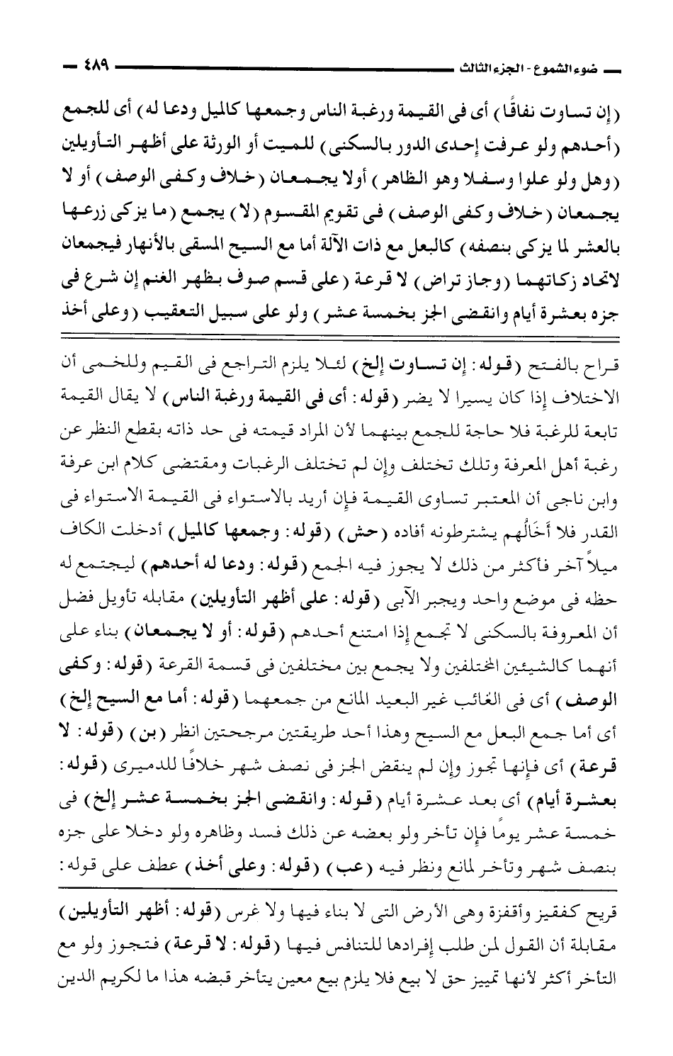 (إن تساوت نفاقًا) أى فى القيمة ورغبة الناس وجمعها كالميل ودعا له) أى للجمع (أحدهم ولو عرفت إحدى الدور بالسكنى) للميت أو الورثة على أظهر التأويلين (وهل ولو علوا وسفلا وهو الظاهر) أولا يجمعان (خلاف وكفى الوصف) أو لا يجمعان (خلاف وكفى الوصف) فى تقويم المقسوم (لا) يجمع (ما يزكى زرعها بالعشر لما يزكى بنصفه) كالبعل مع ذات الآلة أما مع السيح المسقى بالأنهار فيجمعان لاتحاد زكاتهما (وجار تراض) لا قرعة (على قسم صوف بظهر الغنم إن شرع فى جزه بعشرة أيام وانقضى الجز بخمسة عشر) ولو على سبيل التعقيب (وعلى أخذ