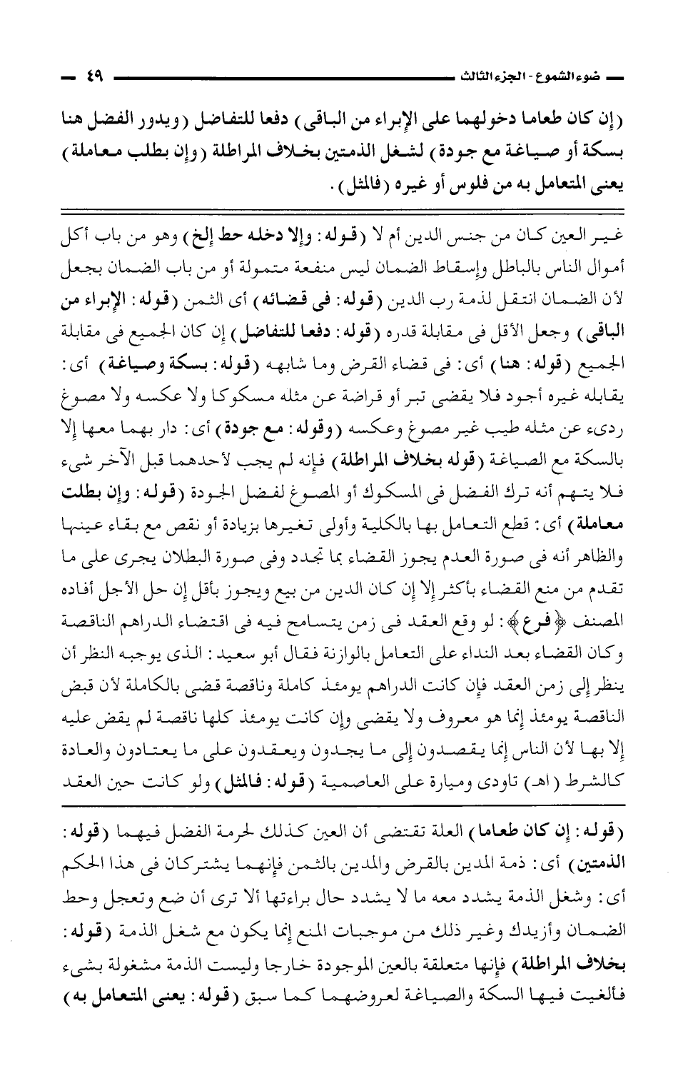 (قوله: إن كان طعاما) العلة تقتضى أن العين كذلك لحرمة الفضل فيهما (قوله: الذمتين) أى: ذمة المدين بالقرض والمدين بالثمن فإنهما يشتركان فى هذا الحكم أى: وشغل الذمة يشدد معه ما لا يشدد حال براءتها ألا ترى أن ضع وتعجل وحط الضمان وأزيدك وغير ذلك من موجبات المنع إنما يكون مع شغل الذمة (قوله: بخلاف المراطلة) فإنه متعلقة بالعين الموجودة خارجا وليست الذمة مشغولة بشئ فألغيت فيها السكة والصياغة لعروضهما كما سبق (قوله: يعنى المتعامل به)