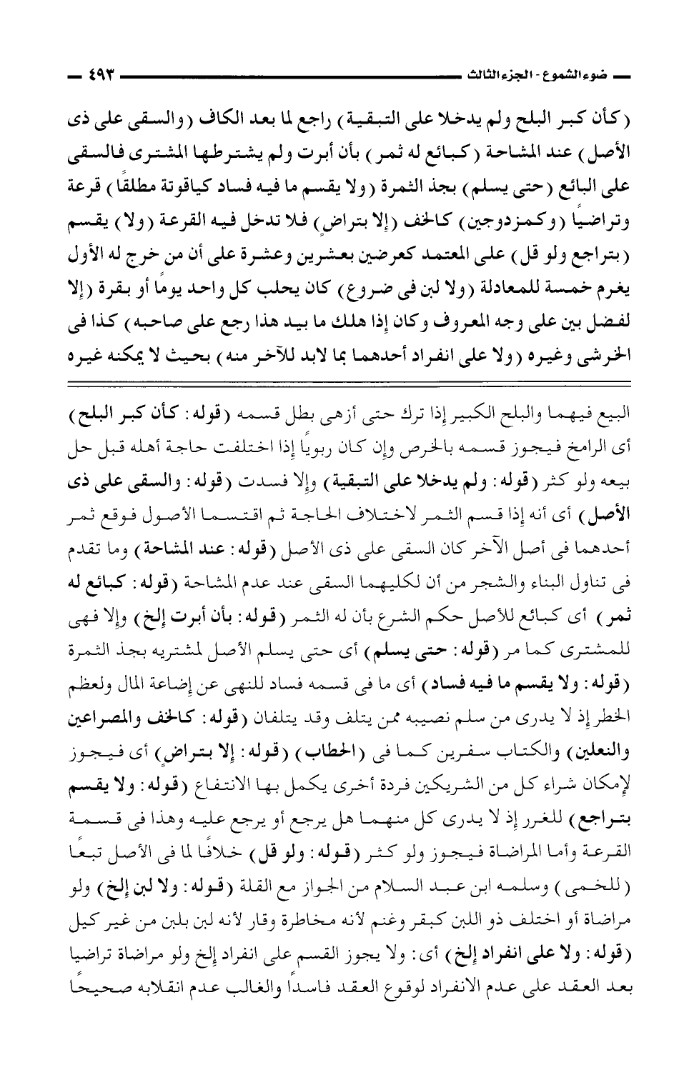 البيع فيهما والبلح الكبير إذا ترك حتى أزهى بطل قسمه (قوله: كأن كبر البلح) أى الرامخ فيجوز قسمه بالخرص وإن كان ربويًا إذا اختلفت حاجة أهله قبل حل ببيعه ولو كثر (قوله: ولم يدخلا على التبقية) وإلا فسدت (قوله: والسقى على ذى الأصل) أى أنه إذا قسم الثمر لاختلاف الحاجة ثم اقتسما الأصول فوقع ثمر أحدهما فى أصل الآخر كان السقى على ذى الأصل (قوله: عند المشاحة) وما تقدم فى تناول البناء والشجر من أن لكيلهما السقى عند عدم المشاحة (قوله: كبائع له ثمر) أى كبائع للأصل حكم الشرع بأن له الثمر (قوله: بأن أبرت إلخ) وإلا فهى للمشترى كما مر (قوله: حتى يسلم) أى حتى يسلم الأصل لمشتريه بجذ الثمرة (قوله: ولا يقسم ما فيه فساد) أى ما فى قسمه فساد للنهى عن إضاعة المال ولعظم الخطر إذ لا يدرى من سلم نصيبه ممن يتلف وقد يتلفان (قوله: كالخف والمصراعين والنعلين) والكتاب سفرين كما فى (الحطاب) (قوله: إلا بتراضٍ) أى فيجوز لإمكان شراء كل من الشريكين فردة أخرى يكمل بها الانتفاع (قوله: ولا يقسم بتراجع) للغرر إذ لا يدرى كل منهما هل يرجع أو يرجع عليه وهذا فى قسمة القرعة وأما المراضاة فيجوز ولو كثر (قوله: ولو قل) خلافًا لما فى الأصل تبعًا (للخمى) وسلمه ابن عبد السلام من الجواز مع القلة (قوله: ولا لبن إلخ) ولو مراضاة أو اختلف ذو اللبن كبقر وغنم لأنه مخاطرة وقار لأنه لبن بلبن من غير كيل (قوله: ولا على انفراد إلخ) أى: ولا يجوز القسم على انفراد إلخ ولو مراضاة تراضيا بعد العقد على عدم الانفراد لوقوع العقد فاسدًا والغالب عدم انقلابه صحيحًا