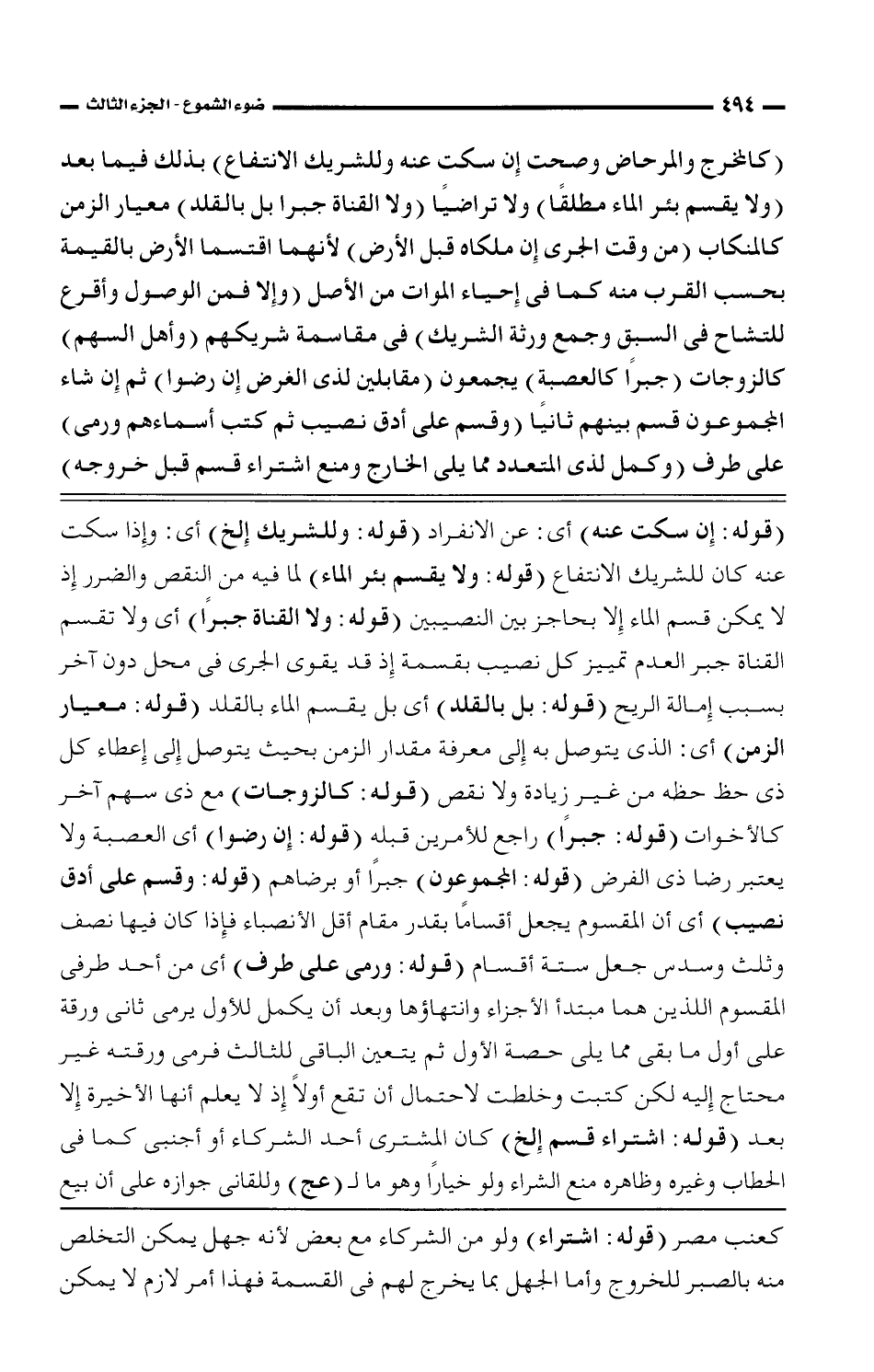(قوله: إن سكت عنه) أى: عن الانفراد (قوله: وللشريك إلخ) أى: وإذا سكت عنه كان للشريك الانتفاع (قوله: ولا يقسم بئر الماء) لما فيه من النقص والضرر إذ لا يمكن قسم الماء إلا بحاجز بين النصيبين (قوله: ولا القناة جبرًا) أى ولا تقسم القناة جبر العدم تمييز كل نصيب بقسمة إذ قد يقوى أخرى فى محل دون آخر بسبب إمالة الريح (قوله: بل بالقلد) أى بل يقسم الماء بالقلد (قوله: معيار الزمن) أى: الذى يتوصل به إلى معرفة مقدار الزمن بحيث يتوصل إلى إعطاء كل ذى حظ من غير زيادة ولا نقص (قوله: كالزوجات) مع ذى سهم آخر كالأخوات (قوله: جبرًا) راجع للأمرين قبله (قوله: إن رضوا) أى العصبة ولا يعتبر رضا ذى الفرض (قوله: المجموعون) جبرًا أو برضاهم (قوله: وقسم على أدق نصيب) أى أن المقسوم يجعل أقسامًا بقدر مقام أقل الأنصاء فإذا كان فيها نصف وثلث وسدس جعل ستة أقسام (قوله: ورمى على طرف) أى من أحد طرفى المقسوم اللذين هما مبتدأ الأجزاء وانتهاؤها وبعد أن يكمل للأول يرمى ثانى ورقة على أول ما بقى مما يلى حصة الأول ثم يتعين الباقى للثالث فرمى ورقته غير محتاج إليه لكن كتبت وخلطت لاحتمال أن تقع أولّا إذ لا يعلم أنها الأخيرة إلا بعد (قوله: اشتراء قسم إلخ) كان المشترى أحد الشركاء أو أجنبى كما فى الحطاب وغيره وظاهره منع الشراء ولو خيارًا وهو ما لـ (عج) وللقانى جوازه على أن بيع