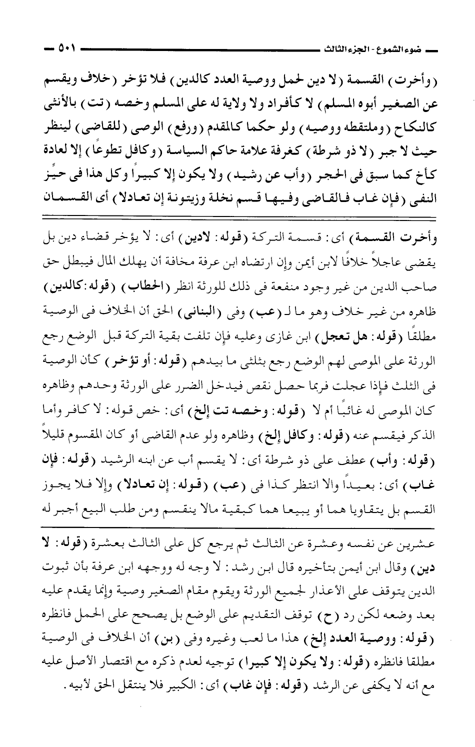عشرين عن نفسه وعشرة عن الثالث ثم يرجع كل على الثالث بعشرة (قوله: لا دين) وقال ابن أيمن بتأخيره قال ابن رشد: لا وجه له ووجهه ابن عرفة بأن ثبوت الدين يتوقف على الأعذار لجميع الورثة ويقوم مقام الصغير وصية وإنما يقدم عليه بعد وضعه لكن رد (ح) توقف التقديم على الوضع بل يصحح على الحمل فانظره (قوله: ووصية العدد إلخ) هذا ما لعب وغيره وفى (بن) أن الخلاف فى الوصية مطلقا فانظره (قوله: ولا يكون إلا كبيرا) توجيه لعدم ذكره مع اقتصار الأصل عليه مع أنه لا يكفى عن الرشد (قوله: فإن غاب) أى: الكبير فلا ينتقل الحق لأبيه.
