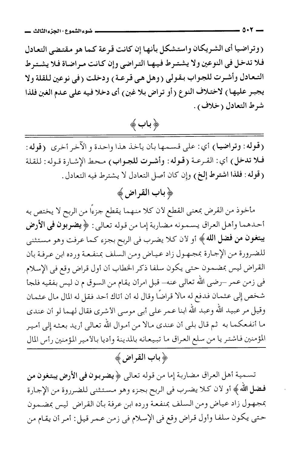مأخوذ من القرض بمعنى القطع لأن كلا منهما يقطع جزءًا من الربح لا يختص به أحدهما وأهل العراق يسمونه مضاربة إما من قوله تعالى: {يضربون فى الأرض يبتغون من فضل الله} أو لأن ك لا يضرب فى الربح بجزء كما عرفت وهو مستثنى للضرورة من الإجارة بمجهول زاد عياض ومن السلف بمنفعة ورده ابن عرفة بأن القراض ليس بمضمون حتى يكون سلفا ذكر الخطاب أو أول قراض وقع فى الإسلام فى زمن عمر - رضى الله تعالى عنه - قبل امرأن يقام من السوق م ن ليس بقيه فلجأ شخص إلى عثمان فدفع له مالا قراضًا وقال له أن أتاك أحد فقل له المال مال عثمان وقيل مر عبيد الله وعبد الله ابنا عمر على أبى موسى الأشرى فقال لهما لو أن عندى ما أنفعكما به ثم قال بلى أن عندى مالا من أموال الله تعالى أريد بعثه إلى أمير