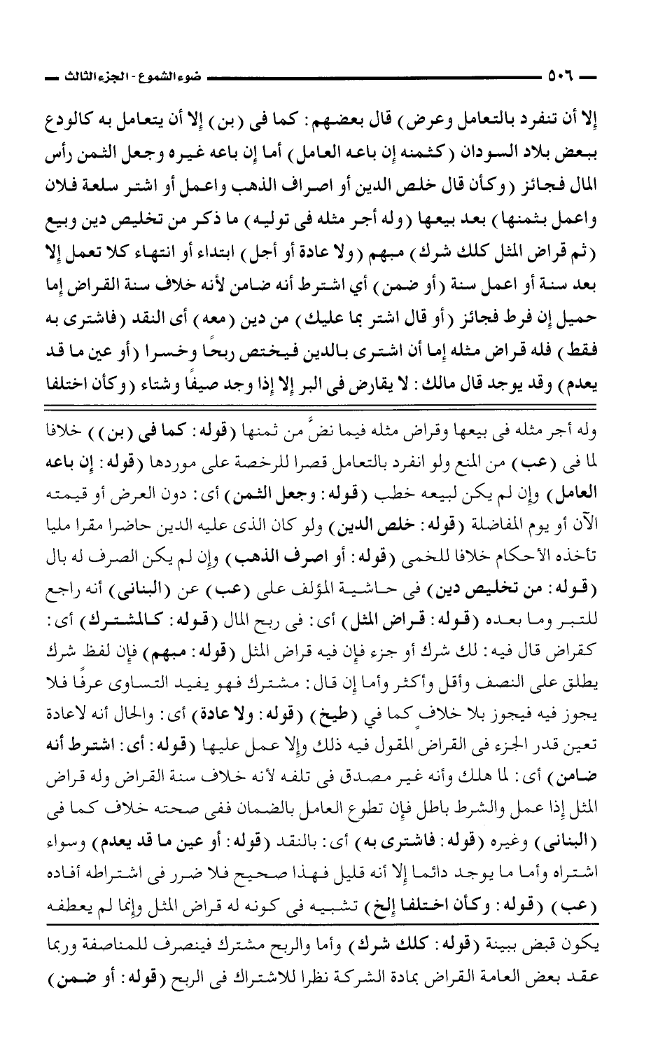 وله أجر مثله فى بيعها وقراض مثله فيما نضَّ من ثمنها (قوله: كما فى (بن) خلافا لما فى (عب) من المنع ولو انفرد بالتعامل قصرا للرخصة على موردها (قوله: إن باعه العامل) وإن لم يكن لبيعه خطب (قوله: وجعل الثمن) أى: دون العرض أو قيمته الآن أو اليوم المفاضلة (قوله: خلص الدين) ولو كان الذى عليه الدين حاضرا مقرا مليا تأخذه الأحكام خلافا للخمى (قوله: أو اصرف الذهب) وإن لم يكن الصرف له بال (قوله: من تخليص دين) فى حاشية المؤلف على (عب) عن (البنانى) أنه راجع للتبر وما بعده (قوله: قراض المثل) أى: فى ربح المال (قوله: كالمشترك) أى: كقراض قال فيه: لك شرك أو جزء فإن فيه قراض المثل (قوله: مبهم) فإن لفظ شرك يطلق على النصف وأقل وأكثر وأما إن قال: مشترك فهو يفيد التساوى عرفًا فلا يجوز فيه فيجوز بلا خلاف كما فى (طيخ) (قوله: ولا عادة) أى: والحال أنه لاعادة تعين قدر الجزء فى القراض المقول فيه ذلك وإلا عمل عليها (قوله: أى: اشترط أنه ضامن) أى: لما هلك وأنه غير مصدق فى تلفه لأنه خلاف سنة القراض وله قراض المثل إذا عمل والشرط باطل فإن تطوع العامل بالضمان ففى صحته خلاف كما فى (البنانى) وغيره (قوله: فاشترى به) أى: بالنقد (قوله: أو عين ما قد يعدم) وسواء اشتراه وأما ما يوجد دائمًا إلا أنه قليل فهذا صحيح فلا ضرر فى اشتراطه أفاده (عب) (قوله: وكأن اختلفا إلخ) تشبيه فى كونه له قراض المثل وإنما لم يعطفه