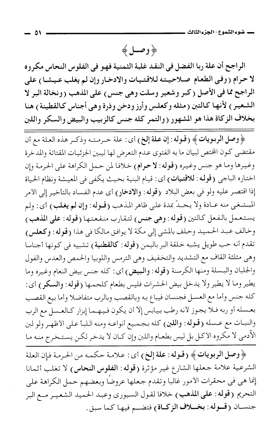 {وصل الربويات} (قوله: علة الخ) أى: علامة حكمه من الحرمة فإن العلة الشرعية علامة جعلها الشارع غير مؤثرة (قوله: الفلوس النحاس) لا تغلب أثمانا إنما هى فى محقرات الأمور غالبا وتقدم جعلها عروضا وبعضهم حمل الكراهة على التحريم (قوله: على المذهب) خلافا لقول السيورى وعبد الحميد الشعير مع البر جنسان (قول: بخلاف الزكاة) فتضم فيها كما سبق.