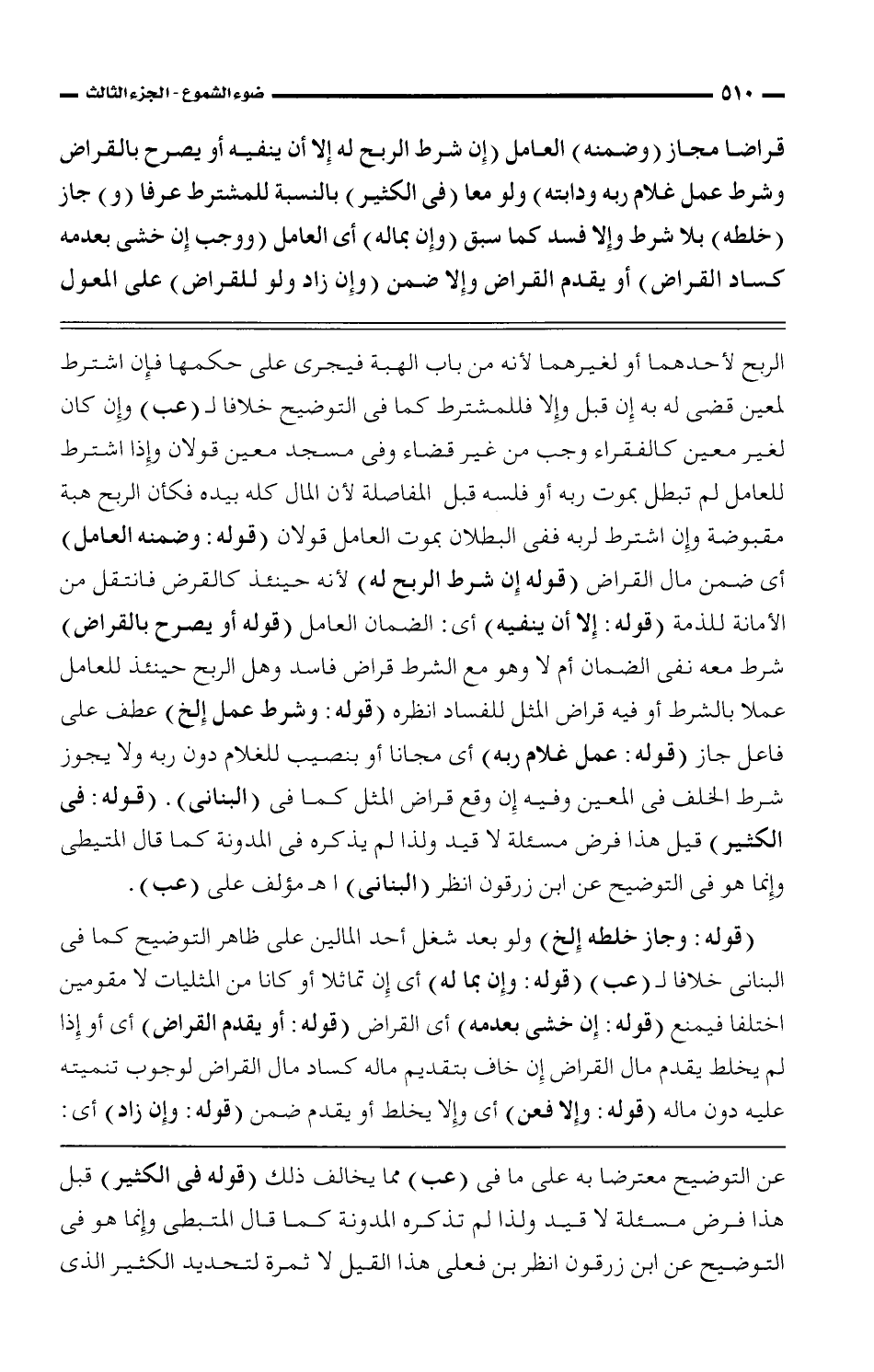 الربح لأحدهما أو لغيرهما لأنه من باب الهبة فيجرى على حكمها فإن اشترط لمعين قضى له به إنق بل وإلا فللمشترط كما فى التوضيح خلافا لـ (عب) وإن كان لغير معين كالفقراء وجب من غير قضاء وفى مسجد معين قولان وإذا اشترط للعامل لم تبطل بموت ربه أو فلسه قبل المفاصلة لأن المال كله بيده فكأن الربح هبة مقبوضة وإن اشترط لربه ففى البطلان بموت العامل قولان (قوله: وضمنه العامل) أى ضمن مال القراض (قوله إن شرط الربح له) لأنه حينئذ كالقرض فانتقل من الأمانة للذمة (قوله: إلا أن ينفيه) أى: الضمان العامل (قوله أو يصرح بالقراض) شرط معه نفى الضمان أم لا وهو مع الشرط قراض فاسد وهل الربح حينئذ للعامل عملا بالشرط أو فيه قراض المثل للفساد انظره (قوله: وشرط عمل إلخ) عطف على فاعل جاز (قوله: عمل غلام ربه) أى مجانا أو بنصيب للغلام دون ربه ولا يجوز شرط الخلف فى المعين وفيه إن وقع قراض المثل كما فى (البنانى). (قوله: فى الكثير) قيل هذا فرض مسئلة لا قيد ولذا لم يذكره فى المدونة كما قال المتيطى وإنما هو فى التوضيح عن ابن زرقون انظر (البنانى) اهـ مؤلف على (عب).