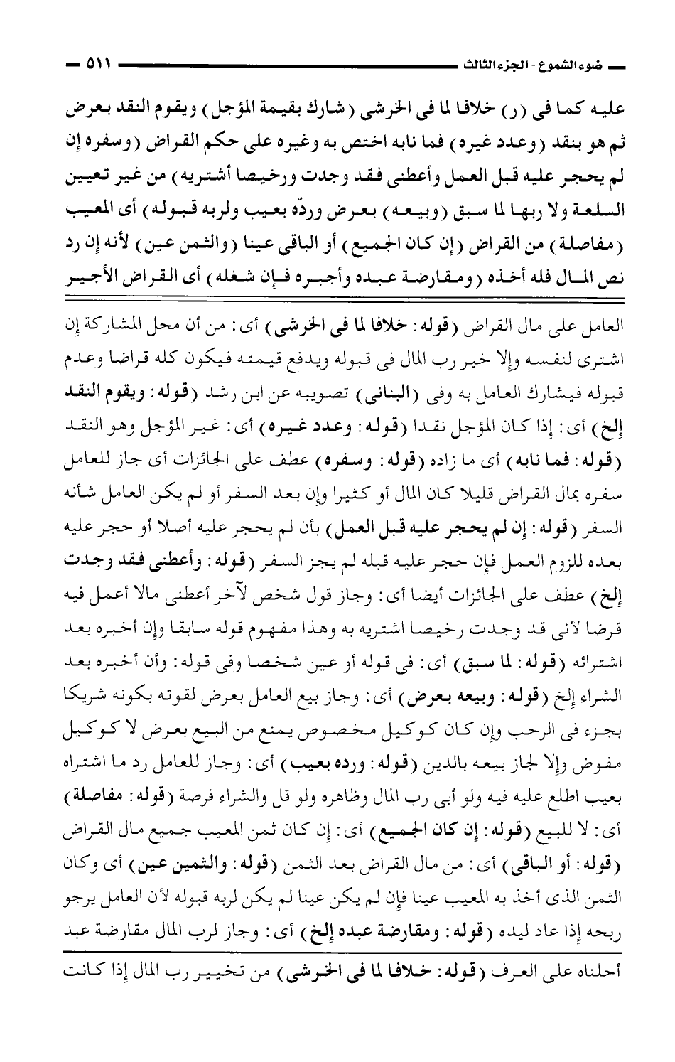 العامل على مال القراض (قوله: خلافا لما فى الخرشى) أى: من أن محل المشاركة إن اشترى لنفسه وإلا خير رب المال فى قبوله ويدفع قيمته فيكون كله قراضا وعدم قبوله فيشارك العامل به وفى (البنانى) تصويبه عن ابن رشد (قوله: ويقوم النقد إلخ) أى: إذا كان المؤجل نقدا (قوله: وعدد غيره) أى: غير المؤجل وهو النقد (قوله: فما نابه) أى ما زاده (قوله: وسفره) عطف على الجائزات أى جاز للعامل سفره بمال القراض قليلا كان المال أو كثيرا وإن بعد السفر أو لم يكن العامل شأنه السفر (قوله: إن لم يحجر عليه قبل العمل) بأن لم يحجر عليه أصلا أو حجر عليه بعده للزوم العمل فإن حجر عليه قبله لم يجز السفر (قوله: وأعطنى فقد وجدت إلخ) عطف على الجائزات أيضا أى: وجاز قول شخص لآخر أعطنى مالا أعمل فيه قرضا لأنى قد وجدت رخيصا اشتريه به وهذا مفهوم قوله سابقا وإن أخبره بعد اشترائه (قوله: لما سبق) أى: فى قوله أو عين شخصا وفى قوله: وأن أخبره بعد الشراء إلخ (قوله: وبيعه بعرض) أى: وجاز بيع العامل بعرض لقوته بكونه شريكا بجزء فى الرحب وإن كان كوكيل مخصوص يمنع من البيع بعرض لا كوكيل مفوض وإلا لجاز بيعه بالدين (قوله: ورده بعيب) أى: وجاز للعامل رد اشتراه بعيب اطلع عليه فيه ولو أبى رب المال وظاهره ولو قل والشراء فرصة (قوله: مفاصلة) أى: لا للبيع (قوله: إن كان الجميع) أى: إن كان ثمن المعيب جميع مال القراض (قوله: أو الباقى) أى: من مال القراض بعد الثمن (قوله: والثمين عين) أى وكان الثمن الذى أخذ به المعيب عينا فإن لم يكن عينا لم يكن لربه قبوله لأن العامل يرجو ربحه إذا عاد ليده (قوله: ومقارضة عبده إلخ) أى: وجاز لرب المال مقارضة عبد