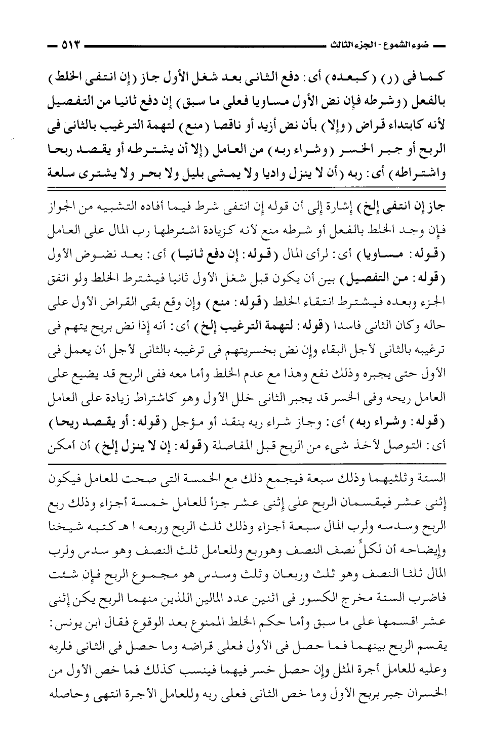 كما فى (ر) (كبعده) أى: دفع الثانى بعد شغل الأول جاز (إن انتفى الخلط) بالفعل (وشرطه فغن نص الأول مساويا فعلى ما سبق) إن دفع ثانيا من التفصيل لأنه كابتداء قراض (وإلا) بأن نض أزيد أو ناقصا (منع) لتهمة الترغيب بالثانى فى الربح أو جبر الخسر (وشراء ربه) من العامل (إلا أن يشترطه أو يقصد ربحا واشتراطه) أى: ربه (أن لا ينزل واديا ولا يشمى بليل ولا بحر ولا يشترى سلعة