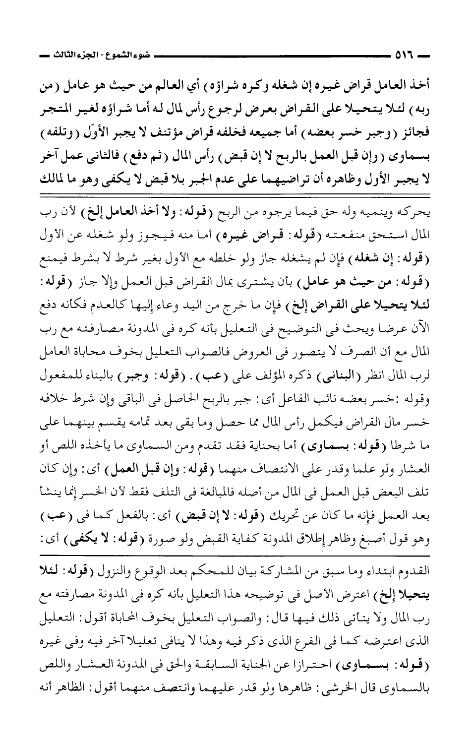 يحركه وينميه وله حق فيما يرجوه من الربح (قوله: ولا أخذ العامل إلخ) لأن رب المال استحق منفعته (قوله: قراض غيره) أما منه فيجوز ولو شغله عن الأول (قوله: إن شغله) فإن لم يشغله جاز ولو خلطه مع الأول لغير شرط لا بشرط فيمنع (قوله: من حيث هو عامل) بأن يشترى بمال القراض قبل العمل وإلا جاز (قوله: لئلا يتحيلا على القراض إلخ) فإن ما خرج من اليد وعاء إليها كالعدم فكأنه دفع الآن عرضا ويحث فى التوضيح فى التعليل بأنه كره فى المدونة مصارفته مع رب المال مع أن الصرف لا يتصور فى العروض فالصواب التعليل بخوف محاباة العامل لرب المال انظر (البنانى) ذكره المؤلف على (عب). (قوله: وجبر) بالبناء للمفعول وقوله: خسر بعضه نائب الفاعل أى: جبر بالربح الحاصل فى الباقى وإن شرط خلافه خسر مال القراض فيكمل رأس المال مما حصل وما بقى بعد تمامه يقسم بينهما على ما شرطا (قوله: بسماوى) أما بحناية فقد تقدم ومن السماوى ما يأخذه اللص أو العشار ولو علما وقدر على الانتصاف منهما (قوله: وإن قبل العمل) أى: وإن كان تلف البعض قبل العمل فى المال من أصله فالمبالغة فى التلف فقط لأن الخسر إنما ينشأ بعد العمل فإنه ما كان عن تحريك (قوله: لا إن قبض) أى: بالفعل كما فى (عب) وهو قول أصبغ وظاهر إطلاق المدونة كفاية القبض ولو صورة (قوله: لا يكفى) أى: