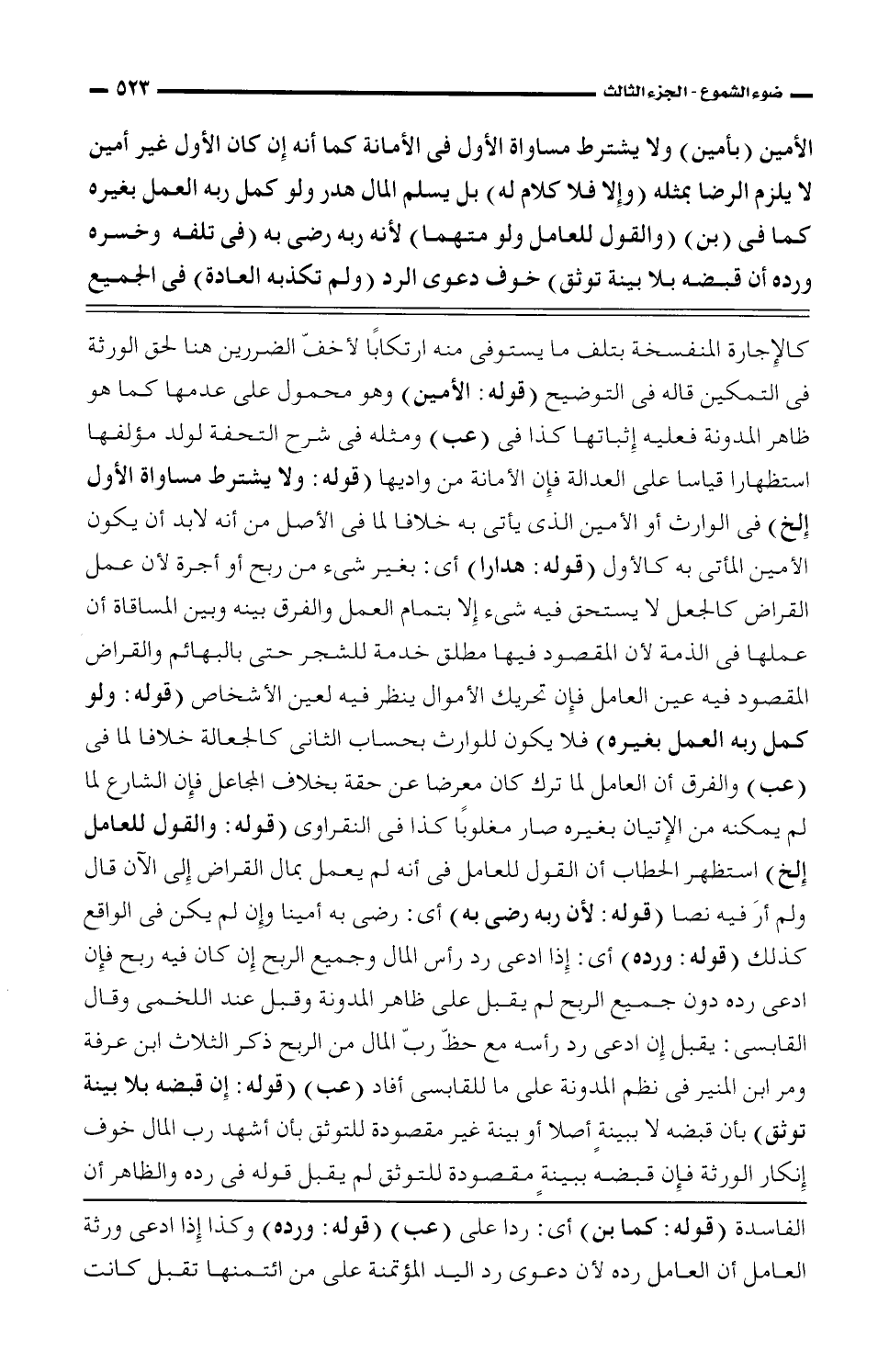 كالإجارة المنفسخة بتلف ما يستوفى منه ارتكابًا لأخفّ الضررين هنا لحق الورثة فى التمكين قاله فى التوضيح (قوله: الأمين) وهو محمول على عدمها كما هو ظاهر المدونة فعليه إثباتها كذا فى (عب) ومثله فى شرح التحفة لولد مؤلفها استظهارا قياسا على العدالة فإن الأمانة من واديها (قوله: ولا يشترط مساواة الأول إلخ) فى الوارث أو الأمين الذى يأتى به خلافا لما فى الأصل من أنه لابد أن يكون الأمين المأتى به كالأول (قوله: هدارا) أى: بغير شئ من ربح أو أجرة لأن عمل القراض كالجعل لا يستحق فيه شئ إلا بتمام العمل والفرق بينه وبين المساقاة أن عملها فى الذمة لأن المقصود فيها مطلق خدمة للشجر حتى بالبهائم والقراض المقصود فيه عين العامل فإن تحريك الأموال ينظر فيه لعين الأشخاص (قوله: ولو كمل ربه العمل بغيره) فلا يكون للوارث بحساب الثانى كالجعالة خلافا لما فى (عب) والفرق أن العامل لما ترك كان معرضا عن حقة بخلاف المجاعة فإن الشارع لما لم يمكنه من الإتيان بغيره صار مغلوبًا كذا فى النقراوى (قوله: والقول للعامل إلخ) استظهر الحطاب أن القول للعامل فى أنه لم يعمل بمال القراض إلى الآن قال ولم أرَ فيه نصا (قوله: لأن ربه رضى به) أى: رضى به أمينا وإن لم يكن فى الواقع كذلك (قوله: ورده) أى: إذا ادعى رد رأس المال وجميع الربح عن كان فيه ربح فإن ادعى رده دون جميع الربح لم يقبل على ظاهر المدونة وقبل عند اللخمى وقال القابسى: يقبل إن ادعى رد رأسه مع حظّ ربّ المال من الربح ذكر الثلاث ابن عرفة ومر ابن المنير فى نظم الدونة على ما للقابسى أفاد (عب) (قوله: إن قبضه بلا بينة توثق) بأن قبضه لا ببينةٍ أصلا أو بينة غير مقصودة للتوثق بأن أشهد رب المال خوف إنكار الورثة فإن قبضه ببينةٍ مقصودة للتوثق لم يقبل قوله فى رده والظاهر أن