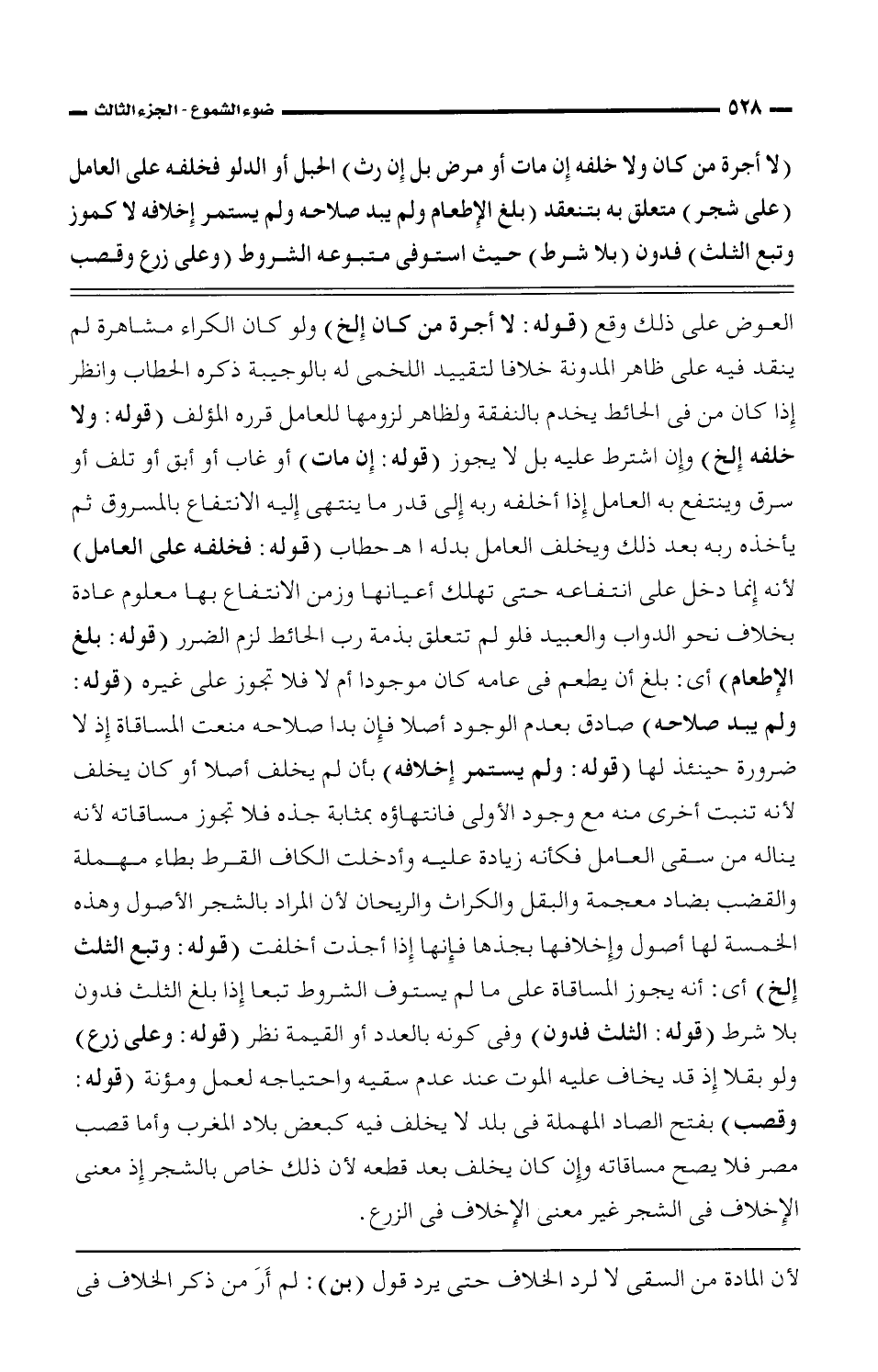 العوض على ذلك وقع (قوله: لا أجرة من كان إلخ) ولو كان الكراء مشاهرة لم ينقد فيه على ظاهر المدونة خلافا لتقييد اللخمى له بالوجية ذكره الحطاب وانظر إذا كان من فى الحائط يخدم بالنفقة ولظاهر لزومها للعامل قرره المؤلف (قوله: ولا خلفه إلخ) وإن اشترط عليه بل لا يجوز (قوله: إن مات) أو غاب أو أبق أو تلف أو سرق وينتفع به العامل إذا أخلفه ربه إلى قدر ما ينتهى إليه الانتفاع بالمسروق ثم يأخذه ربه بعد ذلك ويخلف العامل بدله اهـ حطاب (قوله: فخلفه على العامل) لأنه إنما دخل على انتفاعه حتى تهلك أعيانها وزمن الانتفاع بها معلوم عادة بخلاف نحو الدواب والعبيد فلو لم تتعلق بذمة رب الحائط لزم الضرر (قوله: بلغ الإطعام) أى: بلغ أن يطعم فى عامه كان موجودا أم لا فلا تجوز على غيره (قوله: ولم يبد صلاحه) صادق بعدم الوجود أصلا فإن بدا صلاحه منعت المساقاة إذ لا ضرورة حينئذ لها (قوله: ولم يستمر إخلافه) بأن لم يخلف أصلا أو كان يخلف لأنه تنبت أخرى منه مع وجود الأولى فانتهاؤه بمثابة جذه فلا تجوز مساقاته لأنه يناله من سقى العامل فكأنه زيادة عليه وأدخلت الكاف القرط بطاء مهملة والقضب بضاد معجمة والبقل والكراث والريحان لأن المراد بالشجر الأصول وهذه الخمسة لها أصول وإخلافها بجذها فإنها إذا أجذت أخلفت (قوله: وتبع الثلث إلخ) أى: أنه يجوز المساقاة على ما لم يستوف الشروط تبعا إذا بلغ الثلث فدون بلا شرط (قوله: الثلث فدون) وفى كونه بالعدد أو القيمة نظر (قوله: وعلى زرع) ولو بقلا إذ قد يخاف عليه الموت عند عدم سقيه واحتياجه لعمل ومؤنة (قوله: وقصب) بفتح الصاد المهملة فى بلد لا يخلف فيه كبعض بلاد المغرب وأما قصب مصر فلا يصح مساقاته وإن كان يخلف بعد قطعه لأن ذلك خاص بالشجر إذ معنى الإخلاف فى الشجر غير معنى الإخلاف فى الزرع.