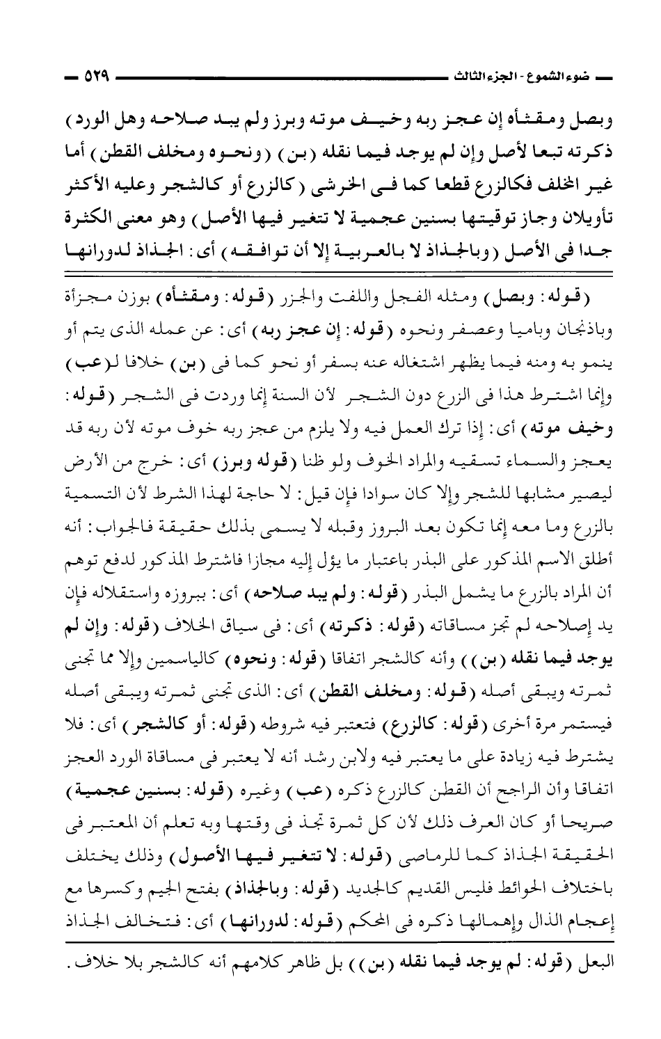 وبصل ومقثأه إن عجز ربه وخيف موته وبرز ولم يبد صلاحه وهل الورد) ذكرته تبعا لأصل وإن لم يوجد فيما نقله (بن) (ونحوه ومخلف القطن) أما غير المخلف فكالزرع قطعا كما فى الخرشى (كالزرع أو كالشجر وعليه الأكثر تأويلان وجاز توقيتها بسنين عجمية لا تتغير فيها الأصل (وهو معنى الكثرة جدا فى الأصل (وباحذاذ لا بالعربية إلا أن توافقه) أى: الجذاذ لدورانها