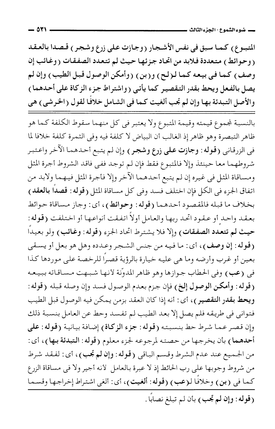 بالنسبة لمجموع قيمته وقيمة المتبوع ولا يعتبر فى كل منهما سقوط الكلفة كما هو ظاهر التبصرة وهو ظاهر إذا الغالب أن البياض لا كلفة فيه وفى الثمرة كلفة خلافا لما فى الزرقانى (قوله: وجازت على زرع وشجر) وإن لم يتبع أحدهما الآخر واعتبر شروطهما معا حينئذ وإلا فالمتبوع فقط فإن لم توجد ففى فاقد الشروط أجرة المثل ومساقاة المثل فى غيره إن لم يتبع أحدهما الآخر وإلا فأجرة المثل فيهما ولابد من اتفاق الجزء فى الكل فإن اختلف فسد وفى كل مساقاة المثل (قوله: قصدًا بالعقد) بخلاف ما قبله فالمقصود أحدهما (قوله: وحوائط) , أى: وجاز مساقاة حوائط بعقد واحد أو عقود تحد ربها والعامل أولًا اتفقت أنواعها أو اختلفت (قوله: حيث لم تتعدد الصفقات) وإلا فلا يشترط اتحاد الجزء (قوله: وغائب) ولو بعيدًا (قوله: إن وصف) , أى: ما فيه من جنس الشجر وعدده وهل هو بعل أو يسقى بعين أو غرب وأرضه وما هى عليه خيارة بالرؤية قصرًا للرخصة على موردها كذا فى (عب) وفى الحطاب جوازها وهو ظاهر المدوّنة لأنها شبهت مساقاته ببيعه (قوله: وأمكن الوصول إلخ) فإن جزم بعدم الوصول فسد وإن وصلة قبله (قوله: ويحط بقدر التقصير) أى: أنه إذا كان العقد بزمن يمكن فيه الوصول قبل الطيب فتوانى فى طريقه فلم يصل إلا بعد الطيب لم تفسد وحط عن العامل بنسبة ذلك وإن قصر عما شرط حط بنسبته (قوله: جزء الزكاة) إضافة بيانية (قوله: على أحدهما) بأن يخرجها من حصته لمرجوعه لجزء معلوم (قوله: التبدئة بها) , أى: من الجميع عند عدم الشرط وقسم الباقى (قوله: وإن لم تجب) , أى: لفقد شرط من شروط وجوبها على رب الحائط إذ لا عبرة بالعامل لأنه أجير ولا فى مساقاة الزرع كما فى (بن) وخلافًا لـ (عب) (قوله: ألغيت) , أى: ألغى اشتراط إخراجها وقسما