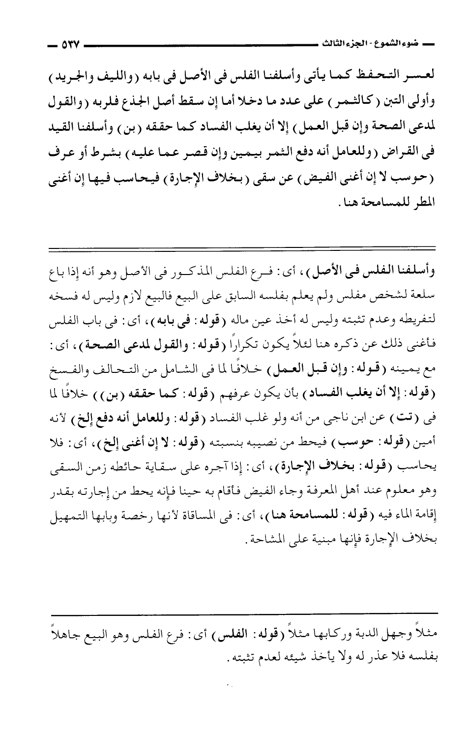 وأسلفنا الفلس فى الأصل) , أى: فرع الفلس المذكور فى الأصل وهو أنه إذا باع سلعة لشخص مفلس ولم يعلم بفسله السابق على البيع فالبيع لازم وليس له فسخه لتفريطه وعدم تثبته وليس له أخذ عين ماله (قوله: فى بابه) , أى: فى باب الفلس فأغنى ذلك عن ذكره هنا لئلا يكون تكرارًا (قوله: والقول لمدعى الصحة) , أى: مع يمينه (قوله: وإن قبل العمل) خلافًا لما فى الشامل من التحالف والفسخ (قوله: إلا أن يغلب الفساد) بأن يكون عرفهم (قوله: كما حققه (بن) خلافًا لما فى (تت) عن ابن ناجى من أنه ولو غلب الفساد (قوله: وللعامل أنه دفع إلخ) لأنه أمين (قوله: حوسب) فيحط من نصيبه بنسبته (قوله: لا إن أغنى إلخ) , أى: فلا يحاسب (قوله: بخلاف الإجارة) , أى: إذا آجره على سقاية حائطه زمن السقى وهو معلوم عند أهل المعرفة وجاء الفيض فأقام به حينا فإنه يحط من إجارته بقدر إقامة الماء فيه (قوله: للمسامحة هنا) , أى: فى المساقاة لأنها رخصة وبابها التمهيل بخلاف الإجارة فإنها مبنية على المشاحة.