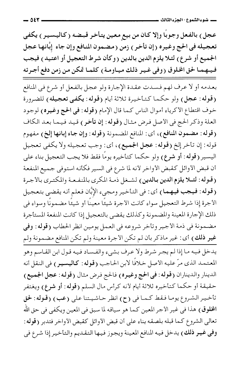 بعدمه أو لا عرف لهم فسدت عقدة الإجارة ولو عجل بالفعل أو شرع فى المنافع (قوله: عجل) ولو حكما كتأخيرة ثلاثة أيام (قوله: يكفى تعجيله) للضرورة خوف اقتطاع الأكرياء أموال الناس كما قال الإمام (قوله: فى الحج وغيره) لوجود العلة وذكر الحج فى الأصل فرض مثال (قوله: إن تأخر) قيد فيما بعد الكاف (قوله: مضمون المنافع) , أى: المنافع المضمونة (قوله: وإن جاء إبانها إلخ) مفهوم قوله: إن تأخر إلخ (قوله: عجل الجميع) , أى: وجب تعجيله ولا يكفى تعجيل اليسير (قوله: أو شرع) ولو حكما كتأخيره يومًا فقط فلا يجب التعجيل بناء على أن قبض الأوةائل كقبض الأواخر لأنه لما شرع فى السير فكأنه استوفى جميع المنفعة (قوله: لئلا يلزم الدين بالدين) لشغل ذمة المكرى بالمنفعة والمكترى بالأجرة (قوله: فيجب فيهما) أى: فى التأخير ومجئ الإِبَّان فعلم أنه يقضى بتعجيل الأجرى إذا شرط التعجيل سواء كانت الأجرة شيئًا معينًا أو شيئًا مضمونًا وسواء فى ذلك الإجارة المعينة والمضمونة وكذلك يقضى بالتعجيل إذا كانت المنفعة المستأجرة مضمونة فى ذمة الأجير وتأخر شروعه فى العمل يومين انظر الحطاب (قوله: وفى غير ذلك) أى: غير ما ذكر بأن لم تكن الأجرة معينة ولم تكن المنافع مضمونة ولم