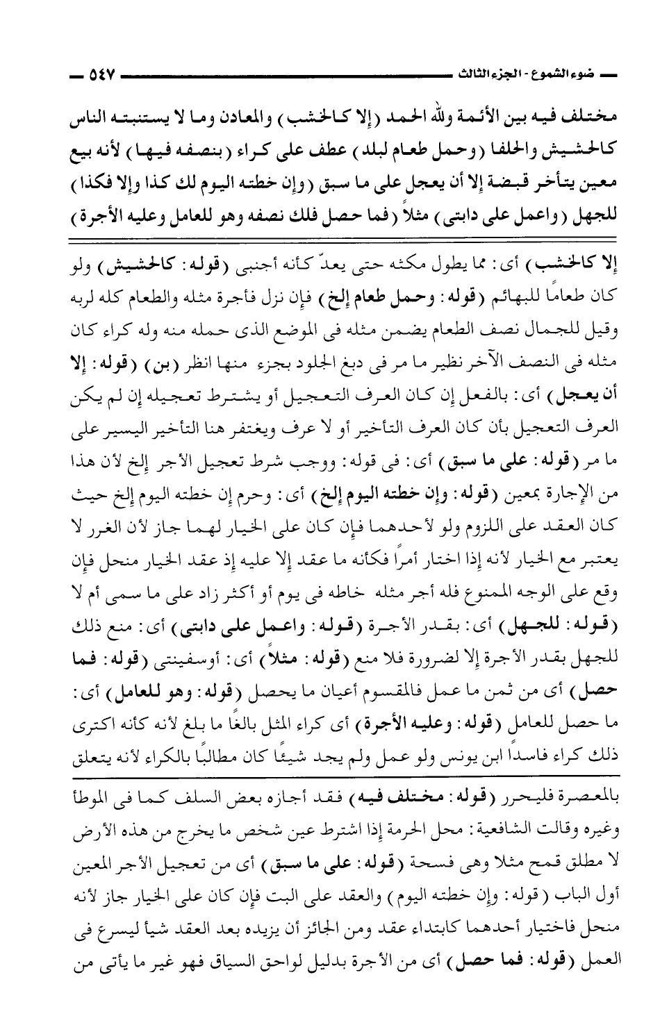 مختلف فيه بين الأئمة ولله الحمد (إلا كالخشب) والمعادن وما لا يستنبته الناس كالحشيش والحلفا (وحمل طعام لبلد) عطف على كراء (بنصفه فيها) لأنه بيع معين يتأخر قبضه إلا أن يعجل على ما سبق (وإن خطته اليوم لك كذا وإلا فكذا) للجهل (واعمل على دابنى) مثلًا (فما حصل فلك نصفه وهو للعامل وعليه الأجرة)