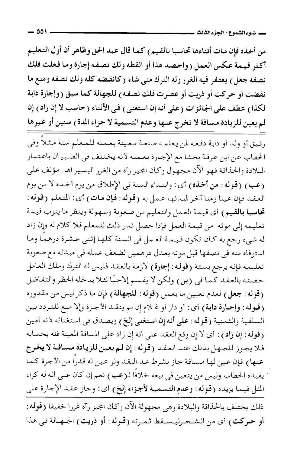 رقيق أو ولد أو دابة دفعه لمن يعلمه صنعة معينة بعمله للمعلم سنة مثلًا وفى الحطاب عن ابن عرفة بحثا مع الإجارة بعمله لأنه يختلف فى الصبيات باعتبار البلادة ولحذاقة فهو الآن مجهول وكأن المجيز رآه من الغرر اليسير اهـ. مؤلف على (عب) (قوله: من أخذه) أى: وابتداء السنة فى الإطلاق من يوم أخذه لا من يوم العقد فإن عينا زمنا آخر لمبدئها عمل به (قوله: فإن مات) أى: المتعلم (قوله: تحاسبا بالقيم) أى قيمة العمل والتعليم من صعوبة وسهولة وينظر ما ينوب قيمة تعليمه إلى موته من قيمة العمل فإذا حصل قدر ذلك للمعلم فلا كلام له وإن زاد له شئ رجع به كأن تكون قيمة العمل فى السنة كلها إثنى عشرة درهمًا وما استوفاه منه فى نصفها قل موته يعدل درهمين لضعف عمله فى مبدئة مع صعوبة تعليمه فإنه يرجع بستة (قوله: إجارة) لازمة بالعقد فليس له الترك وملك العامل حصته بالعقد كما فى (بن) ولكن لا يقسم إلا حبّا لئلا يدخله الحظر والتفاضل (قوله: جعل) لعدم تعيين ما يعمل (قوله: للجهالة) فإن ما ذكر ليس من مقدوره (قوله: وإجارة دابة) أى: أو دار أو غلام إن لم ينقد الأجرة وإلا منع للتردد بين السلفية والثمنية (قوله: على أنه إن استغنى إلخ) ويصدق فى استغنائه لأنه أمين (قوله: إن زاد): أى لا إن وقع العقد على أنه إن زاد على المسافة المعينة فله بحسابه فلا يجوز للجهل بذلك عند العقد (قوله: إن لم يعين للزيادة مسافة لا يخرج عنها) فإن عين لها مسافة جاز بشرط عد النقد ولو عين له قدرًا من الأجرة كما يفيده الحطاب وليس من يتعين فى بيعه خلافًا لـ (عب) نعم إن كان على أنه له كراء المثل فيما يزيده (قوله: وعدم التسمية لأجزاء إلخ) أى: وجاز عقد الإجارة على