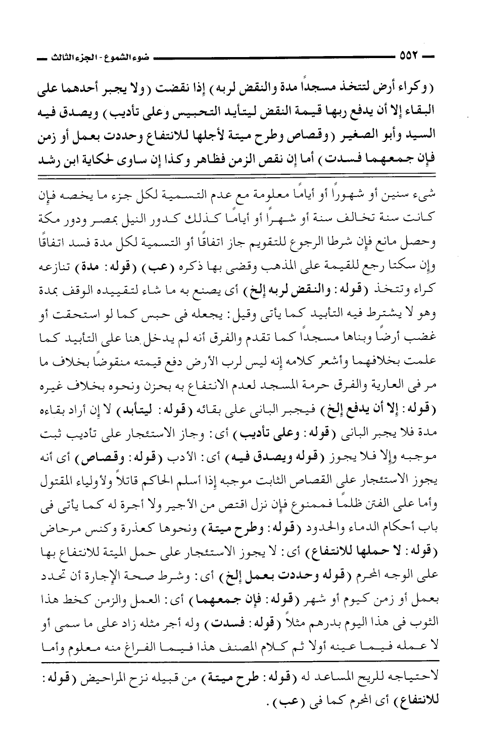 (وكراء أرض لتتخذ مسجدًا مدة النقض لربه) إذا نقضت (ولا يجبر أحدهما على البقاء إلا أن يدفع ربها قيمة النقض ليتأيد التحبيس وعلى تأديب) ويصدق فيه السيد وأبو الصغير (وقصاص وطرح ميتة لأجلها للانتفاع وحددت بعمل أو زمن فإن جمعهما فسدت) أما إن نقص الزمن فظاهر وكذا إن ساوى لحكاية ابن رشد