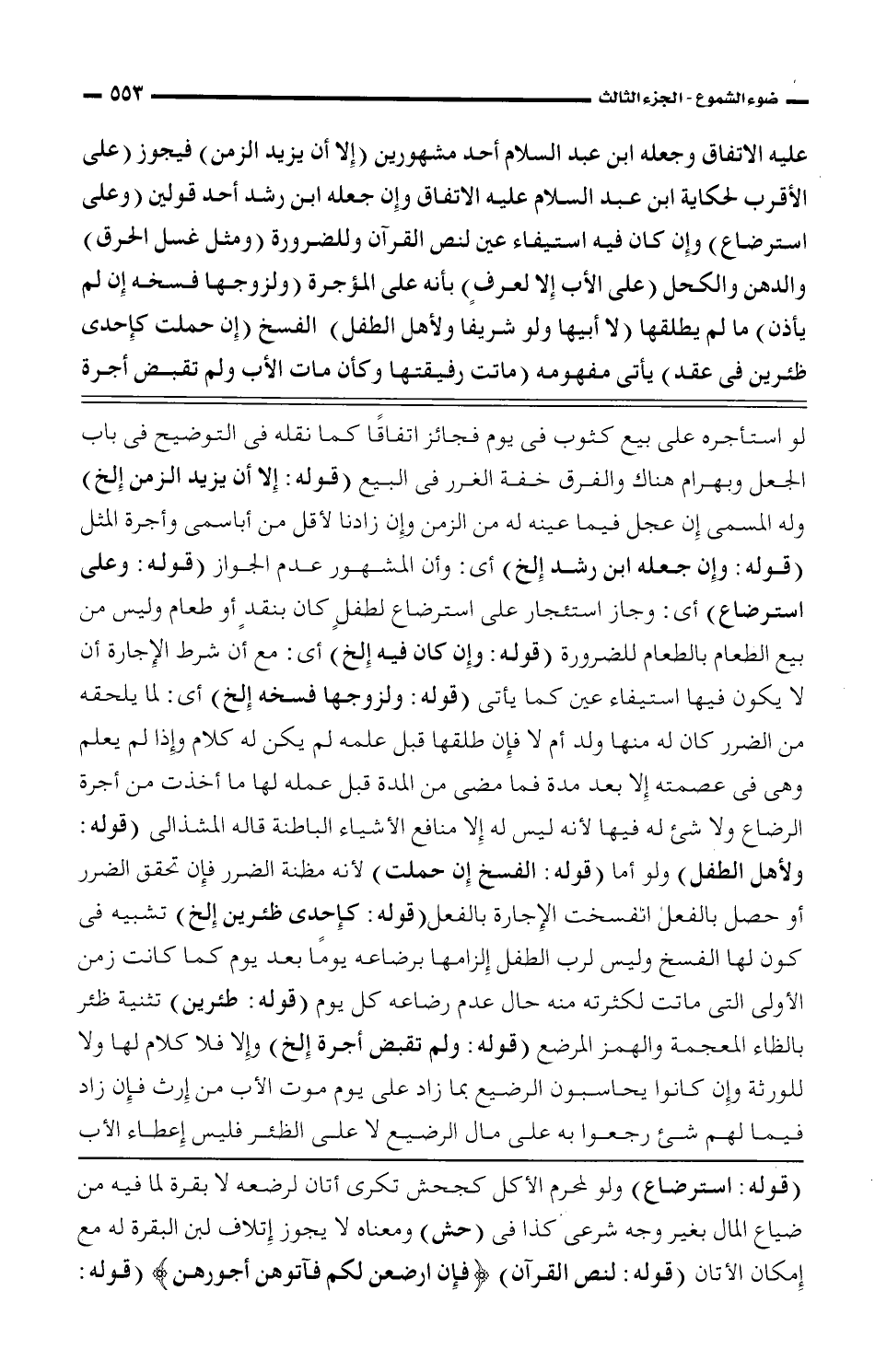 عليه الاتفاق وجعله ابن عبد السلام أحد مشهورين (إلا أن يزيد الزمن) فيجوز (على الأقرب لحكاية ابن عبد السلام عليه الاتفاق وإن جعله ابن رشد أحد قولين (وعلى استرضاع) وإن ك ان فيه استيفاء عين لنص القرآن وللضرورة (ومثل غسل الحرق) والدهن والكحل (على الأب إلا لعرف) بأنه على المؤجرة (ولزوجها فسخه إن لم يأذن) ما لم يطلقها (لا أبيها ولو شريفا ولأهل الطفل) الفسخ (إن حملت كإحدى ظئرين فى عقد) يأتى مفهومه (ماتت رفيقتها وكأن مات الأب ولم تقبض أجرة