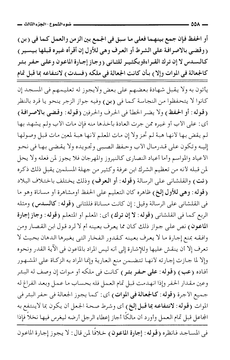 يأتون به ولا يقبل شهادة بعضهم على بعض ولا يجوز له تعليمهم فى المسجد إن كانوا لا يتحفظوا من النجاسة كما فى (بن) وفيه جواز الزجر بنحو يا قرد بالنظر (قوله: أو الحفظ) ولا يضر الخطأ فى الحرف والحرفين (قوله: وقضى بالاصرافة) أى: على الأب أو غيره ممن جرت العادة بأخذها منه فإن مات الأب ولم يشهد بها لم يقض بها لأنها هبة لم تحز ولا إن مات المعلم لأنها هبة لمعين مات قبل وصولها إليه وتكون على قدر مال الأب وحفظ الصبى وتجويده ولا يقضى بها فى نحو الأعياد والمواسم وأما أعياد النصارى كالنيروز والمهرجان فلا يجوز لمن فعله فى نحو الأعياد والمواسم وأما أعياد النصارى كالنيروز والمهرجان فلا يجوز لمن فعله ولا يحل لمن قبله لأنه من تعظيم الشرك ابن عرفة وكثير من جهلة المسلمين يقبل ذلك ذكره (تتب) والقلشانى على الرسالة (قوله: أو العرف) وذلك يختلف باختلاف البلاد (قوله: وهى للأول إلخ) ظاهره كان التعليم على الحفظ أو مشاهرة أو مساناة وهو ما فى القلشانى على الرسالة وقيل: إن كانت مساناة للثانى (قوله: كالسدس) ومثله الربع كما فى القلشانى (قوله: لا إن ترك) أى: المعلم أو المتعلم (قوله: وجاز إجارة الماعون) نص على جواز ذلك كان مما يعرف بعينه أم لا لرد قول ابن القصار ومن وافقه بمنع إجارة ما لا يعرف بعينه كقدور الفخار التى يعيرها الدهان بحيث لا تعرف إلا أن ينقش عليها وللإشارة إلى أنه ليس المراد بالماعون فى الآية القدر ونحوه وإلا لما جازت إجارته لأنها تتضمن منع العارية وإنما المراد به الزكاة على المشهور أفاده (عب) (قوله: على حفر بئر) كانت فى ملكه أو موات إن وصف له البئر وعين مقدار الحفر وإذا انهدمت قبل تمام العمل فله بحساب ما عمل وبعد الفراغ له جميع الأجرة (قوله: كالجعالة فى الموات) أى: كما يجوز الجعالة فى حفر البئر فى الموات (قوله: لانتفاعه بما قبل إلخ) أى وشرط صحة الجعل أن يكون بما لا ينتفع به المجاعل قبل تمام العمل وأورد أن مالكًا أجاز إعطاء الرجل أرضه ليغرس فيها نخلًا فإذا