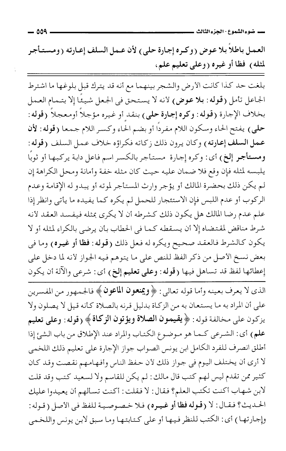 الذى لا يعرف بعينه وأما قوله تعالى: {ويمنعون الماعون} فالجمهور من المفسرين على أن المراد به ما يستعان به من الزكاة بدليل قرنه بالصلاة كأنه قيل لا يصلون ولا يزكون على مخالفة قوله: {يقيمون الصلاة ويؤتون الزكاة} (قوله: وعلى تعليم علم) أى: الشرعى كما هو موضوع الكتاب والمراد عند الإطلاق من باب الشئ إذا أطلق انصرف للفرد الكامل ابن يونس الصوب جواز الإجارة على تعليم ذلك اللخمى لا أرى أن يختلف اليوم فى جواز ذلك لأن حفظ الناس وأفهامهم نقصت وقد كان كثير ممن تقدم ليس لهم كتب قال مالك: لم يكن للقاسم ولا لسعيد كتب وقد قلت لابن شهاب أكنت تكتب العلم؟ فقال: لا فقلت: أكنت تسألهم أن يعيدوا عليك الحديث؟ فقال: لا (قوله: فظا أو غيره) فلا خصوصية للفظ فى الأصل (قوله: وإجارتها) أى: الكتب للنظر فيها أو على كتابتها وما سبق لابن يونس واللخمى