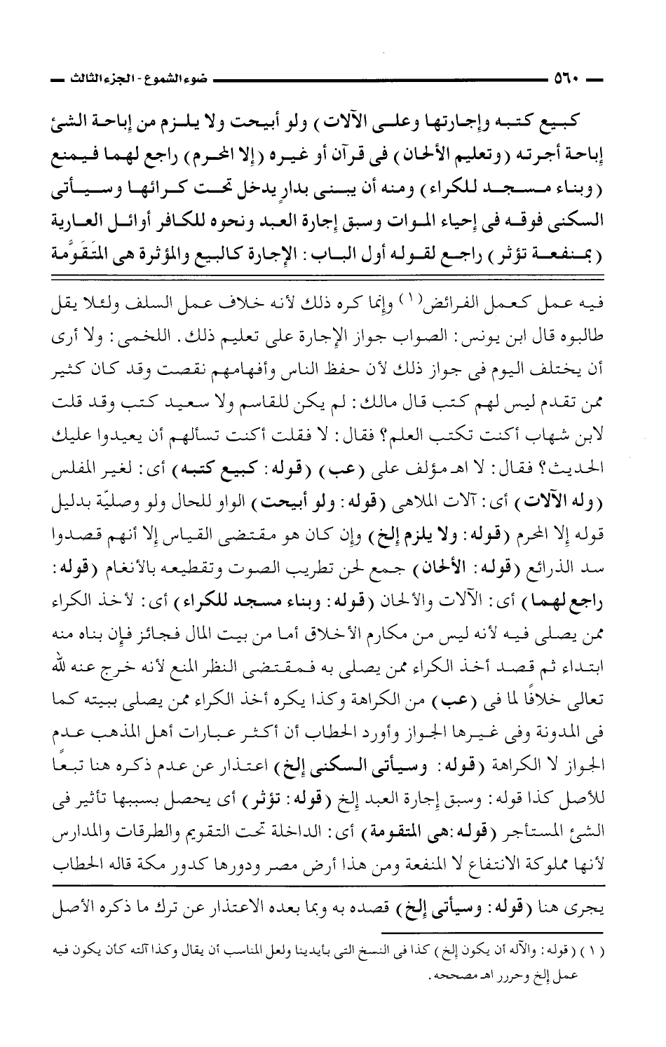 فيه عمل كعمل الفرائض وإنما كره ذلك لأنه خلاف عمل السلف ولئلا يقل طالبوه قال ابن يونس: الصواب جواز الإجارة على تعليم ذلك. اللخمى: ولا أرى أن يختلف اليوم فى جواز ذلك لأن حفظ الناس وأفهامهم نقصت وقد كان كثير ممن تقدم ليس لهم كتب قال مالك: لم يكن للقاسم ولا سعيد كتب وقد قلت لابن شهاب أكنت تكتب العلم؟ فقال: لا فقلت أكنت تسألهم أن يعيدوا عليك الحديث؟ فقال: لا اهـ مؤلف على (عب) (قوله: كبيع كتبه) أى: لغير المفلس (وله الآلات) أى: آلات الملاهى (قوله: ولو أبيحت) الواو للحال ولو وصليّة بدليل قوله إلا المحرم (قوله: ولا يلزم إلخ) وإن كان هو مقتضى لقياس إلا أنهم قصدوا سد الذرائع (قوله: الألحان) جمع لحن تطريب الصوت وتقطيعه بالأنغام (قوله: راجع لهما) أى: الآلات والألحان (قوله: وبناء مسجد للكراء) أى: لأخذ الكراء ممن يصلى فيه لأنه ليس من مكارم الأخلاق أما من بيت المال فجائز فإن بناه منه ابتداء ثم قصد أخذ الكراء ممن يصلى به فمقتضى النظر المنع لأنه خرج عنه لله تعالى خلافًا لما فى (عب) من الكراهة وكذا يكره أخذ الكراء ممن يصلى ببيته كما فى المدونة وفى غيرها الجواز وأورد الحطاب أن أكثر عبارات أهل المذهب عدم الجواز لا الكراهة (قوله: وسيأتى السكنى إلخ) اعتذار عن عدم ذكره هنا تبعًا للأصل كذا قوله: وسبق إجارة العبد إلخ (قوله: تؤثر) أى يحصل بسببها تأثير فى الشئ المستأجر (قوله: هى المتقومة) أى: الداخلة تحت التقويم والطرقات والمدارس لأنها مملوكة الانتفاع لا المنفعة ومن هذا أرض مصر ودورها كدور مكة قاله الحطاب