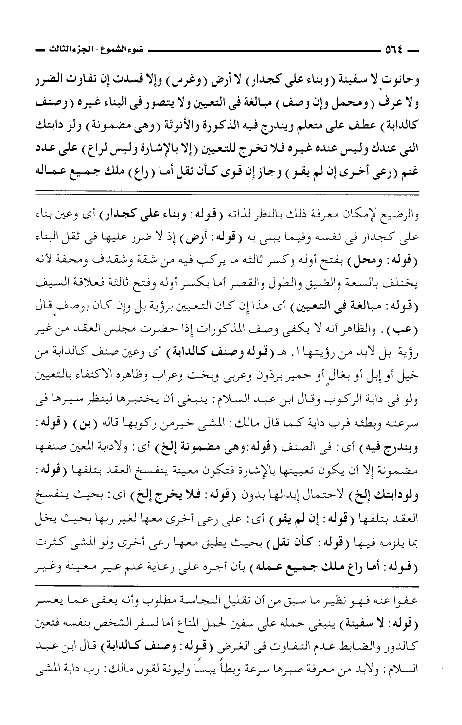 والرضيع لإمكان معرفة ذلك بالنظر لذاته (قوله: وبناء على كجدار) أى وعين بناء على كجدار فى نفسه وفيما يبنى فيه (قوله: أرض) إذ لا ضرر عليها فى ثقل البناء (قوله: ومحل) بفتح أوله وكسر ثالثه ما يركب فيه من شقة وشقدف ومحفة لأنه يختلف بالسعة والضيق والطول والقصر أما بكسر أوله وفتح ثالثة فعلاقة السيف (قوله: مبالغة فى التعيين) أى هذا إن كان التعيين برؤية بل وإن كان بوصف قال (عب). والظاهر أنه لا يكفى وصف المذكورات إذا حضرت مجلس العقد كالدابة من خيل أو إبل أو بغالٍ أو حمير برذون وعربى وبخت وعراب وظاهره الاكتفاء بالتعيين ولو فى دابة الركوب وقال ابن عبد السلام: ينبغى أن يختبرها لينظر سيرها فى سرعته وبطئه فرب دابة كما قال مالك: المشى خير من ركوبها قاله (بن) (قوله: سرعته وبطئه فرب دابة كما قال مالك: المشى خير من ركوبها قاله (بن) (قوله: ويندرج فيه) أى: فى الصنف (قوله: وهى مضمونة إلخ) أى: ولا دابة المعين صنفها مضمونة إلا أن يكون تعيينها بالإشارة فتكون معينة ينفسخ العقد بتلفها (قوله: ولو دابتك إلخ) لاحتمال إبدالها بدون (قوله: فلا يخرج إلخ) أى: بحيث ينفسخ العقد بتلفها (قوله: إن لم يقو) أى: على رعى أخرى معها لغير ربها بحيث يخل بما يلزمه فيها (قوله: كأن نقل) بحيث يطيق معها رعى أخرى ولو المشى كثرت (قوله: أما راع ملك جميع عمله) بأن أجره على رعاية غنم غير معينة وغير