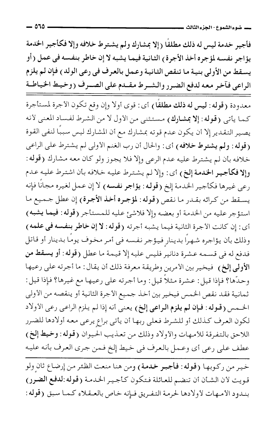 معدودة (قوله: ليس له ذلك مطلقًا) أى: قوى أولا وإن وقع تكون الأجرة لمستأجرة كما يأتى (قوله: إلا بمشارك) مستثنى من الأول لا من الشرط لفساد لمعنى لأنه يصير التقدير إلا أن يكون عدم قوته بمشارك مع أن المشارك ليس سببًا لنفى القوة (قوله: ولم يشترط خلافه) أى: والحال أن رب الغنم الأولى لم يشترط على الراعى خلافه بأن لم يشترط عليه عدم الرعى وإلا فلا يجوز ولو كان مشارك (قوله: وإلا فكأجير الخدمة إلخ) أى: وإلا لم يشترط عليه خلافه بأن اشترط عليه عدم رعى غيرها فكأجير الخدمة إلخ (قوله: يؤاجر نفسه) لا إن عمل لغيره مجانًا فإنه يسقط من كرائه بقدر ما نقص (قوله: لمؤجره أخذ الأجرة) إن عطل جميع ما استؤجر عليه من الخدمة أو بعضه وإلا فلا شئ عليه للمستأجر (قوله: فيما يشبه) أى: إن كانت الأجرة الثانية فيما يشبه أجرته (قوله: لا إن خاطر بنفسه فى علمه) وذلك بأن يؤاجره شهرا بدينارٍ فيؤجر نفسه فى أمر مخوف يومًا بدينار أو قاتل فدفع له فى قسمه عشرة دنانير فليس عليه إلا قيمة ما عطل (قوله: أو يسقط من الأولى إلخ) فيخير بين الأمرين وطريقة معرفة ذلك أن يقال: ما أجرته على رعيها وحدّها؟ فإذا قيل: عشرة مثلًا قيل: وما أجرته على رعيها مع غيرها؟ فإذا قيل: ثمانية فقد نقص الخمس فيخير بين أخذ جميع الأجرة الثانية أو ينقصه من الأولى الخمس (قوله: فإن لم يلزم الراعى إلخ) يعنى أنه إذا لم يلزم الراعى رعى الأولاد لكون العرف كذلك أو للشرط فعلى ربها أن يأتى براعٍ يرعى معه أولادها للضرر اللاحق بالتفرقة للأمهات والأولاد وذلك من تعذيب الحيوان (قوله: وخيط إلخ) عطف على رعى أى وعمل بالعرف فى خيط إلخ فمن جرى العرف بأنه عليه