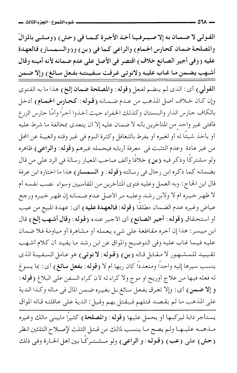 القولى لا ضمان به إلا صير فيا أخذ الأجرة كما فى (حش) (ومشى بالمزال والمصلحة ضمان كحارس الحمام) والراعى كما فى (بن) و (والسمسار) فالعهدة عليه (وفى أجير الصانع خلاف) اقتصر فى الأصل على عدم ضمانه لأنه أمينه وقال أشهب يضمن ما غاب عليه (لا نوتى غرقت سفينته بفعل سائغ) وإلا ضمن