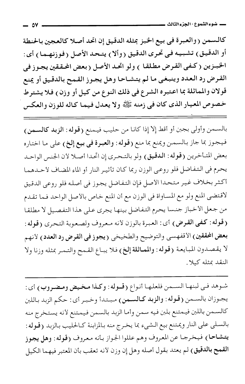 كالسمن (والعبرة فى بيع الخبز بمثله الدقيق إن اتحد أصلا كالعجين بالحنطة أو الدقيق) تشبيه فى تحرى الدقيق (وألا) يتحد الأصل (فوزنهما) أى: الخبزين (كفى القرض مطلقا) ولو اتحد الأصل (بعض المحققين يجوز فى القرض رد العدد وينبغى ما لم يتشاحا وهل يجوز القمح بالدقيق أو يمنع قولان والمماثلة بما اعتبره الشرع فى ذلك النوع من كيل أو وزن) فلا يشترط خصوص المعيار الذى كان فى زمنه صلى الله عليه وسلم ولا يعدل فيما كاله للوزن والعكس