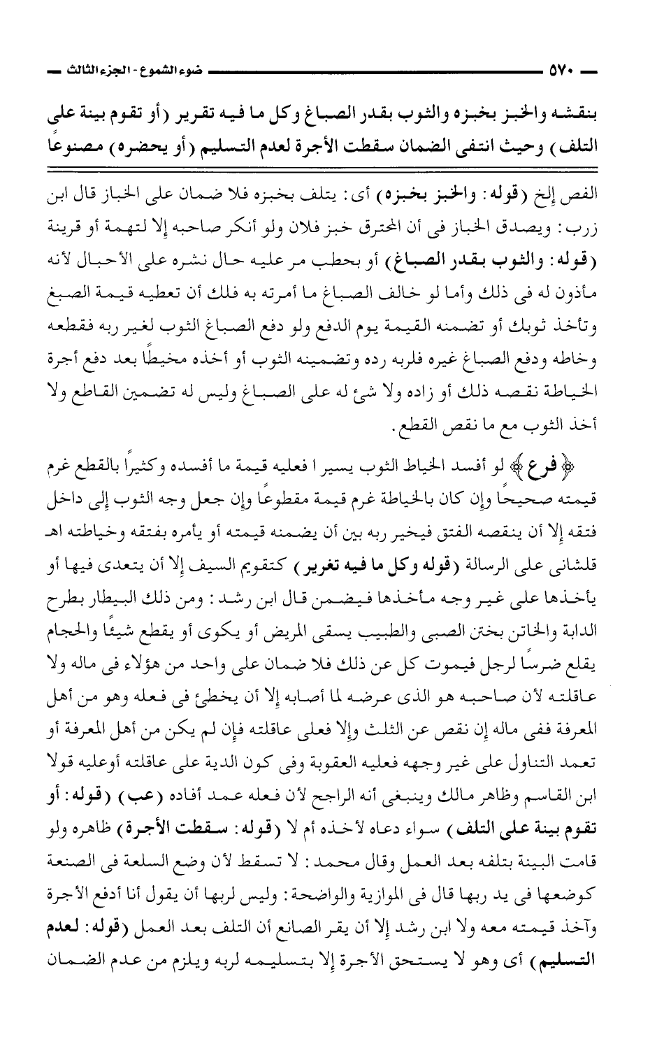 {فرع} لو أفسد الخياط الثوب يسيرا فعليه قيمة ما فسده وكثيرًا بالقطع غرم قيمته صحيحًا وإن كان بالخياطة غرم قيمة مقطوعًا وإن جعل وجه الثوب إلى داخل فتقه إلا أن ينقصه الفتق فيخير ربه بين أن يضمنه قيمته أو يأمره بفتقه وخياطته اهـ قلشانى على الرسالة (قوله وكل ما فيه تغرير) كتقويم السيف إلا أن يتعدى فيها أو يأخذها على غير وجه مأخذها فيضمن قال ابن رشد: ومن ذلك البيطار بطرح الدابة والخاتن بختن الصبى والطبيب يسقى المريض أو يكوى أو يقطع شيئًا والحجام يقلع ضرسًا لرجل فيموت كل عن ذلك فلا ضمان على واحد من هؤلاء فى ماله ولا عاقلته لأن صاحبه هو الذى عرضه لما أصابه إلا أن يخطئ فى فعله وهو من أهل المعرفة ففى ماله إن نقص عن الثلث وإلا فعلى عاقلته فإن لم يكن من أهل المعرفة أو تعمد التناول على غير وجهه فعليه العقوبة وفى كون الدية على عاقلته أو عليه قولا ابن القاسم وظاهر مالك وينبغى أنه الراجح لأن فعله عمد أفاده (عب) (قوله: أو تقوم بينة على التلف) سواء دعاه لأخذه أم لا (قوله: سقطت الأجرة) ظاهره ولو قامت البينة بتلفه بعد العمل وقال محمد: لا تسقط لأن وضع السلعةى فى الصنعة كوضعها فى يد ربها قال فى الموازية والواضحة: وليس لربها أن يقول أنها أدفع الأجرة وآخذ قيمته معه ولا ابن رشد إلا أن يقر الصانع أن التلف بعد العمل (قوله: لعدم التسليم) أى وهو لا يستحق الأجرة إلا بتسليمه لربه ويلزم من عدم الضمان