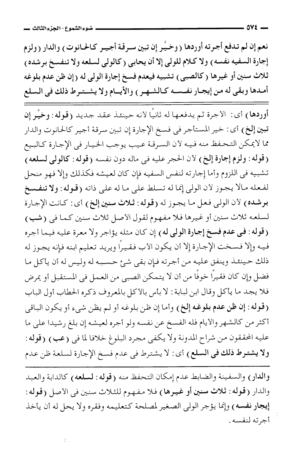 والدار) والسفينة والضابط عدم إمكان التحفظ منه (قوله: لسلعه) كالدابة والعبد والدار (قوله: ثلاث سنين أو غيرها) فلا مفهوم للثلاث سنين فى الأصل (قوله: إيجار نفسه) وإنما يؤجر الولى الصغير لمصلحة كتعليمه وفقره ولا يحل له أن يأخذ أجرته لنفسه.