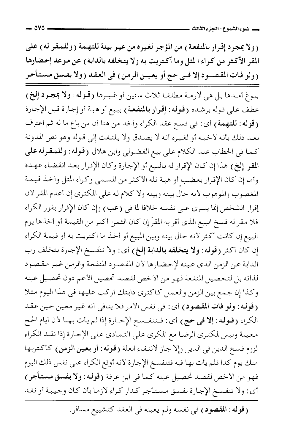 (وإلا بمجرد إقرار بالمنفعة) من المؤجر لغيره من غير بينة للتهمة (وللمقر له) على المقر الأكثر من كراء المثل وما أكتريت به ولا يتخلفه بالدابة) عن موعد إحضارها (ولو فات المقصود إلا فى حج أو يعين الزمن) فى العقد (ولا بفسق مستأجر