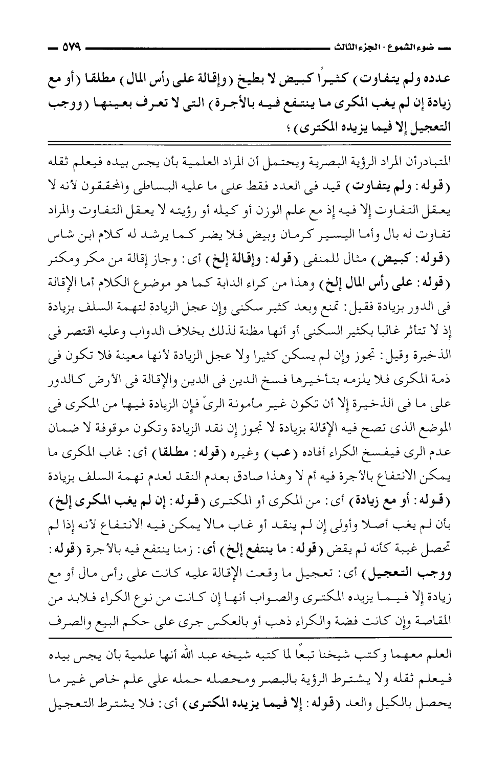 العلم معهما وكتب شيخنا تبعًا لما كتبه شيخه عبد الله أنها علمية بأن يجس بيده فيعلم ثقله ولا يشترط الرؤية بالبصر ومحصله حمله على علم خاص غير ما يحصل بالكيل والعد (قوله: إلا فيما يزيده المكترى) أى: فلا يشترط التعجيل