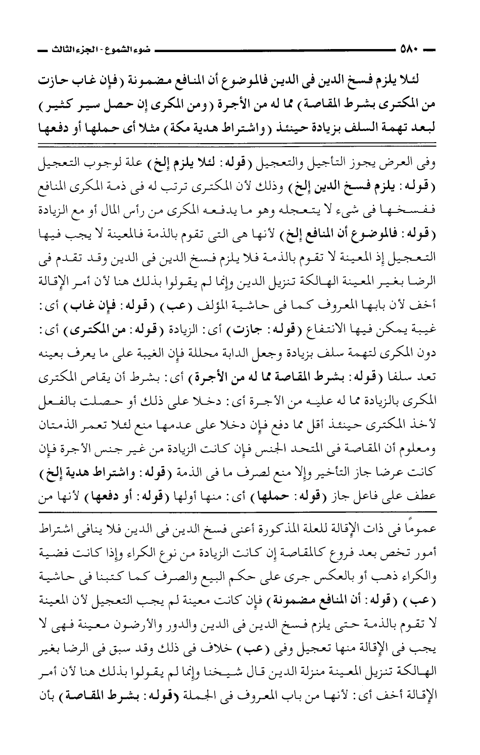 عمومًا فى ذات الإقالة للعلة المذكورة أعنى فسخ الدين فى الدين فلا ينافى اشتراط أمور تخص بعد فروع كالمقاصة إن كانت الزيادة من نوع الكراء وإذا كانت فضية والكراء ذهب أو بالعكس جرى على حكم البيع والصرف كما كتبنا فى حاشية (عب) (قوله: أن المنافع مضمونة) فإن كانت معينة لم يجب التعجيل لأن المعينة لا تقوم بالذمة حتى يلزم فسخ الدين فى الدين والدور والأرضون معينة فهى لا يجب فى الإقالة منها تعجيل وفى (عب) خلاف فى ذلك وقد سبق فى الرضا بغير الهالكة تنزيل المعينة منزلة الدين قال شيخنا وإنما لم يقولوا بذلك هنا لأن أمر الإقالة أخف أى: لأنها من باب المعروف فى الجملة (قوله: بشرط المقاصة) بأن