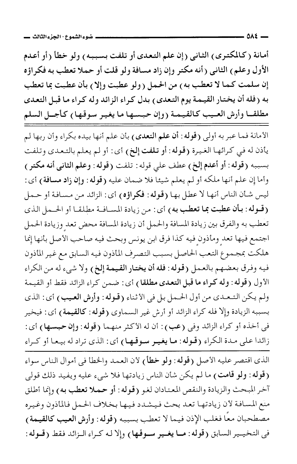 الذى اقتصر عليه الأصل (قوله: ولو خطأ) لأن العمد والخطأ فى أموال الناس سواء (قوله: ولو قامت) ما لم يكن شأن الناس زيادتها فلا شئ عليه ويفيد ذلك قولى آخر المبحث والزيادة والنقص المعتادان لغو (قوله: أو حملا تعطب به) وإنما أطلق منع المسافة لأن زيادتها تعد بحث فيشدد فيها بخلاف الحمل فالمأذون وغيره مصطحبان معًا فغلب الإذن فيما لا تعطب بسببه (قوله: وأرش العيب كالقيمة) فى التخيير السابق (قوله: ما يغير سوقها) وإلا له كراء الزائد فقط (قوله: