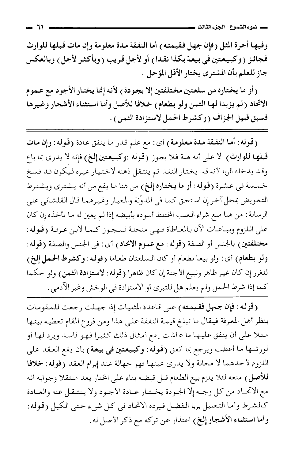 (قوله: فإن جهل فقيمته) على قاعدة المثليات إذا جهلت رجعت للمقومات بنظر أهل المعرفة فيقال ما تبلغ قيمة النفقة على هذا ومن فروع المقام تعطيه بيتها مثلا على أن ينفق عليه ما عاشت يقع أمثال ذلك كثيرا فهو فاسد ويرد لها أو لورثتها ما أعطت ويرجع بما أنفق (قوله: وكبيعتين فى بيعة) بأن يقع العقد على اللزوم لأحدهما لا محالة ولا يدرى عينها فهو جهالة عند إبرام العقد (قوله: خلافا للأصل) منعه لئلا يلزم بيع الطعام قبل قبضه بناء على المختار يعد منتقلا وجوابه أنه مع الاتحاد من كل وجه إلا الجودة يختار عادة الأجود ولا ينتقل عنه والعادة كالشرط وأما التعليل بربا الفضل فيرده الاتحاد فى كل شئ حتى الكيل (قوله: وأما استثناء الأشجار إلخ) اعتذار عن تركه مع ذكر الأصل له.