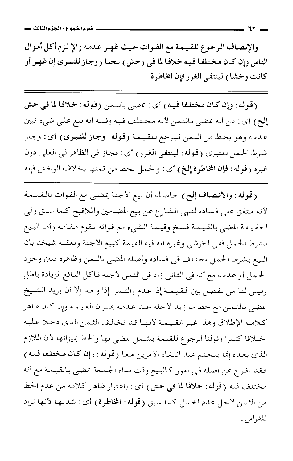 (قوله: والانصاف إلخ) حاصله أن بيع الأجنة يمضى مع الفوات بالقيمة لأنه متفق على فساده لنهى الشارع عن بيع المضامين والملاقيح كما سبق وفى الحقيقة المضى بالقيمة فسخ وقيمة الشئ مع فواته تقوم مقامه وأما البيع بشرط الحمل ففى الخرشى وغيره أنه فيه القيمة كبيع الأجنة وتعقبه شيخنا بأن البيع بشرط الحمل مختلف فى فساده وأصله المضى بالثمن وظاهره تبين وجود الحمل أو عدمه مع أنه فى الثانى زاد فى الثمن لأجله فأكل البائع الزيادة باطل وليس لنا من يفصل بين القيمة إذا عدم والثمن إذا وجد إلا أن يريد الشيخ المضى بالثمن مع حط ما زيد لأجله عند عدمه بميزان القيمة وإن كان ظاهر كلامه الإطلاق وهذا غير القيمة لأنها قد تخالف الثمن الذى دخلا عليه اختلافا كثيرا وقولنا الرجوع للقيمة يشمل المضى بها والحط بميزانها لأن اللازم الذى بعده إنما يتحتم عند انتفاء الأمرين معا (قوله: وإن كان مختلفا فيه) فقد خرج عن أصله فى أمور كالبيع وقت نداء الجمعة يمضى بالقيمة مع أنه مختلف فيه (قوله: خلافا لما فى حش) أى: باعتبار ظاهر كلامه من عدم الحط من الثمن لأجل عدم الحمل كما سبق (قوله: المخاطرة) أى: شدتها لأنها تراد للفراش.