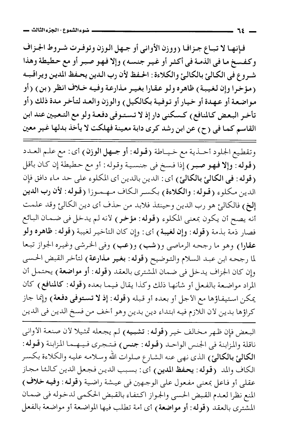 فإنها لا تباع حزافا (ووزن الأوانى أو جهل الوزن وتوفرت شروط الجزاف وكفسخ ما فى الذمة فى أكثر أو غير جنسه) وإلا فهو صبر أو مع حطيطة وهذا شروع فى الكالئ بالكالئ والكلاءة: الحفظ لأن رب الدين يحفظ المدين ويراقبه (مؤخرا وإن لغيبة) ظاهره ولو عقارا بغير مذارعة وفيه خلاف انظر (بن) (أو مواضعة أو عهدة أو خيار أو توفية بكالكيل) والوزن والعد لتأخر مدة ذلك (أو تأخر البعض كالمنافع) كسكنى دار إذ لا تستوفى دفعة ولو مع التعيين عند ابن القاسم كما فى (ح) عن ابن رشد كرى دابة معينة فهلكت لا يأخذ بدلها غير معين