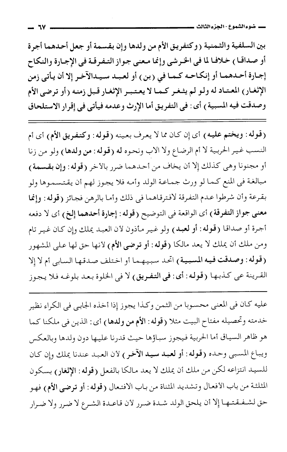 بين السلفية والثمنية (وكتفريق الأم من ولدها وإن بقسمة أو جعل أحدهما أجرة أو صداقا) خلافا لما فى الخرشى وإنما معنى جواز التفرقة فى الإجارة والنكاح إجارة أحدهما أو إنكاحه كما في (بن) أو لعبد سيد الآخر إلا أن يأتى زمن الإثغار) المعتاد له ولو لم يثغر كما لا يعتبر الإثغار قبل زمنه (أو ترضى الأم وصدقت فيه المسبية) أى: فى التفريق أما الإرث وعدمه فياتى فى إقرار الاستلحاق