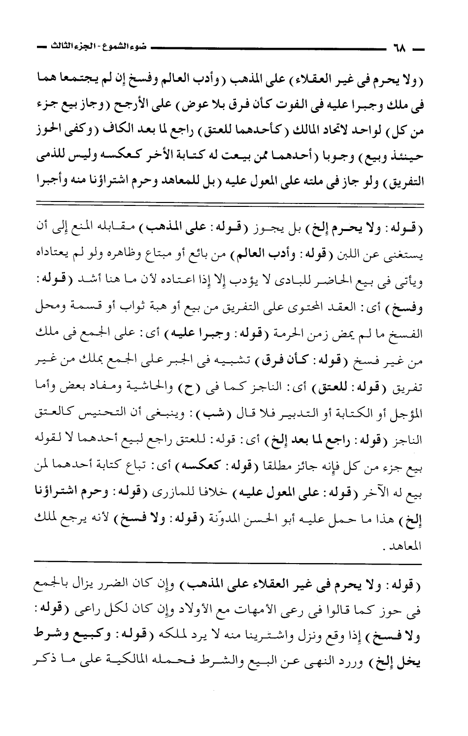 (قوله: ولا يحرم فى غير العقلاء على المذهب) وإن كان الضرر يزال بالجمع فى حوز كما قالوا فى رعى الأمهات مع الأولاد وإن كان لكل راعى (قوله: ولا فسخ) إذا وقع ونزل واشترينا منه لا يرد لملكه (قوله: وكبيع وشرط يخل إلخ) وورد النهى عن البيع والشرط فحمله المالكية على ما ذكر