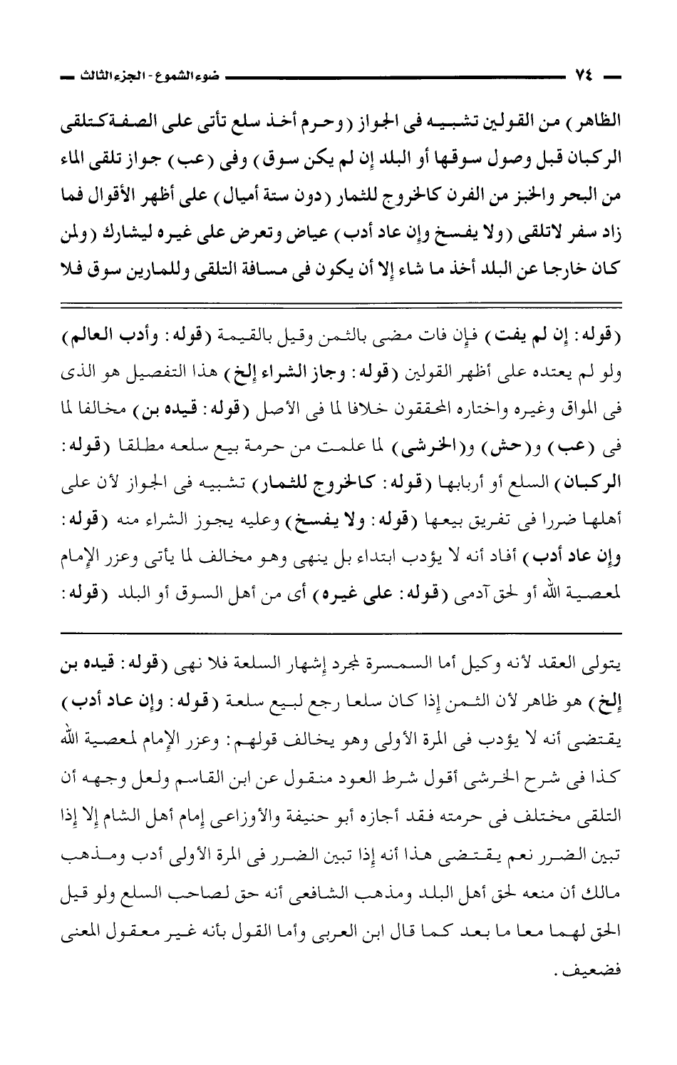 يتولى العقد لأنه وكيل أما السمسرة لمجرد إشهار السلعة فلا نهى (قوله: قيده بن إلخ) هو ظاهر لأن الثمن إذا كان سلعا رجع لبيع سلعة (قوله: وإن عاد أدب) يقتضى أنه لا يؤدب فى المرة الأولى وهو يخالف قولهم: وعزر الإمام لمعصية الله كذا فى شرح الخرشى أقول شرط العود منقول عن ابن القاسم ولعل وجهه أن التلقى مختلف فى حرمته فقد أجازه أبو حنيفة والأوزاعى إمام أهل الشام إلا إذا تبين الضرر نعم يقتضى هذا أنه إذا تبين الضرر فى المرة الأولى أدب ومذهب مالك أن منعه لحق أهل البلد ومذهب الشافعى أنه حق لصاحب السلع ولو قيل الحق لهما معا ما بعد كما قال ابن العربى وأما القول بأنه غير معقول المعنى فضعيف.