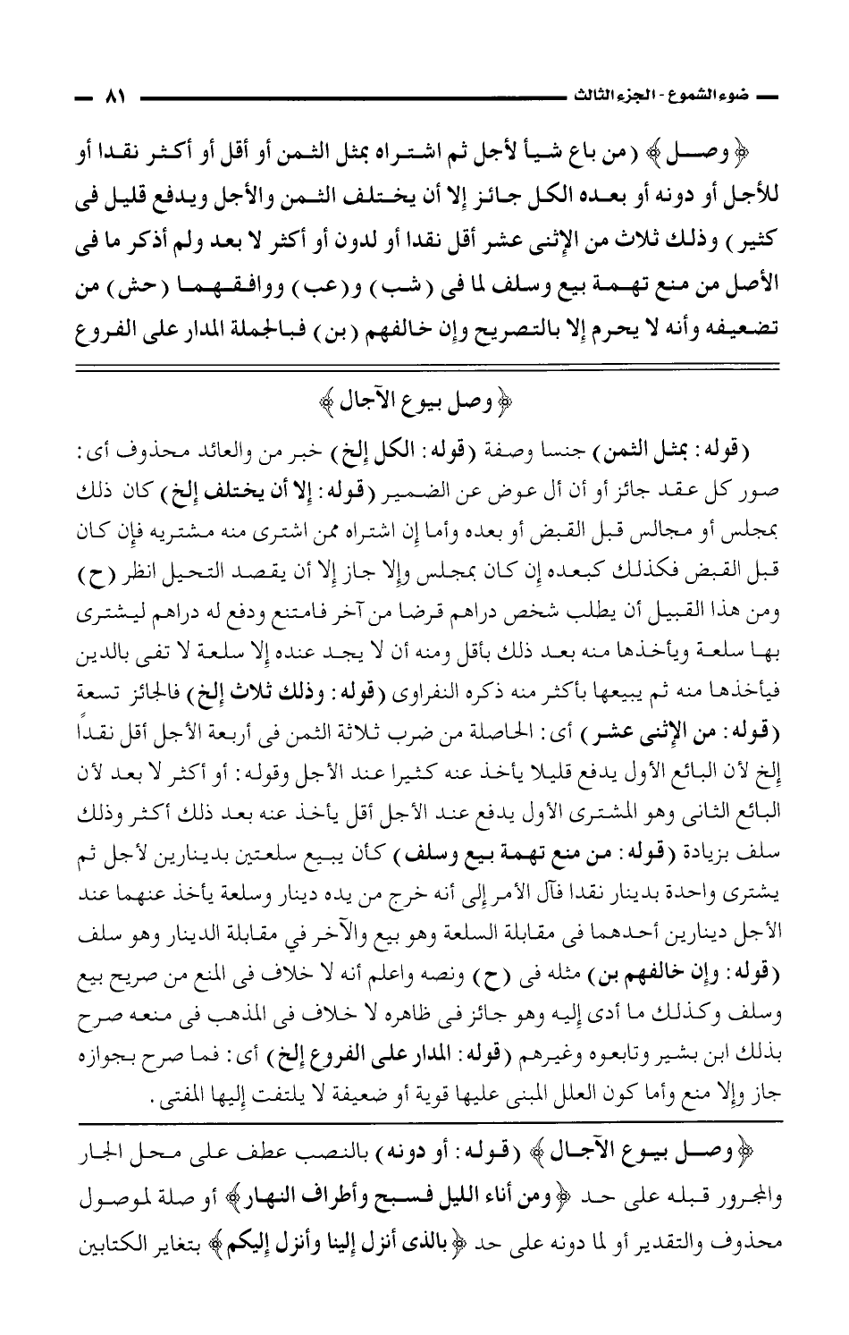 {وصل بيوع الآجال} (قوله: أو دونه) بالنصب عطف على محل الجار والمجرور قبله على حد {ومن أناء الليل فسبح وأطراف النهار} أو صلة لموصول محذوف والتقدير أو لما دون على حد {بالذى أنزل إلينا وأنزل إليكم} بتغاير الكتابين