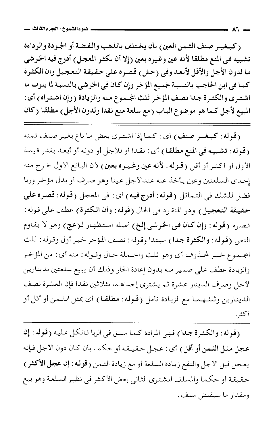 (قوله: والكثرة جدا) فهى المرادة كما سبق فى الربا فاتكل عليه (قوله: إن عجل مثل الثمن أو أقل) أى: عجل حقيقة أو حكما بأن كان دون الأجل فإنه يعجل قبل الأجل والنفع زيادة السلعة أو مع زيادة الثمن (قوله: إن عجل الأكثر) حقيقة أو حكما والمسلف المشترى الثانى بعض الأكثر فى نظير السلعة وهو بيع ومقدار ما سيقبض سلف.