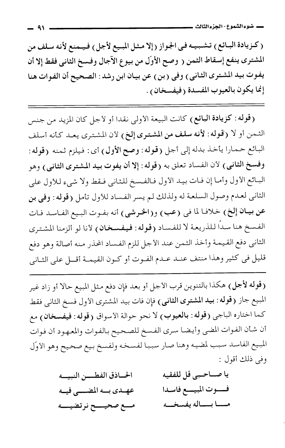 (قوله لأجل) هكذا بالتنوين قرب الأجل أو بعد فإن دفع مثل المبيع حالا أو زاد غير المبيع جاز (قوله: بيد المشترى الثانى) فإن فات بيد المشترى الأول فسخ الثانى فقط كما اختاره الباجى (قوله: بالعيوب) لا نحو حوالة الأسواق (قوله: فيفسخان) مع أن شأن الفوات المضى وأيضا سرى الفسخ للصحيح بالفوات والمعهود أن فوات المبيع الفاسد سبب لمضيه وهنا صار سببا لفسخه ولفسخ بيع صحيح وهو الأوّل وفى ذلك أقول:
