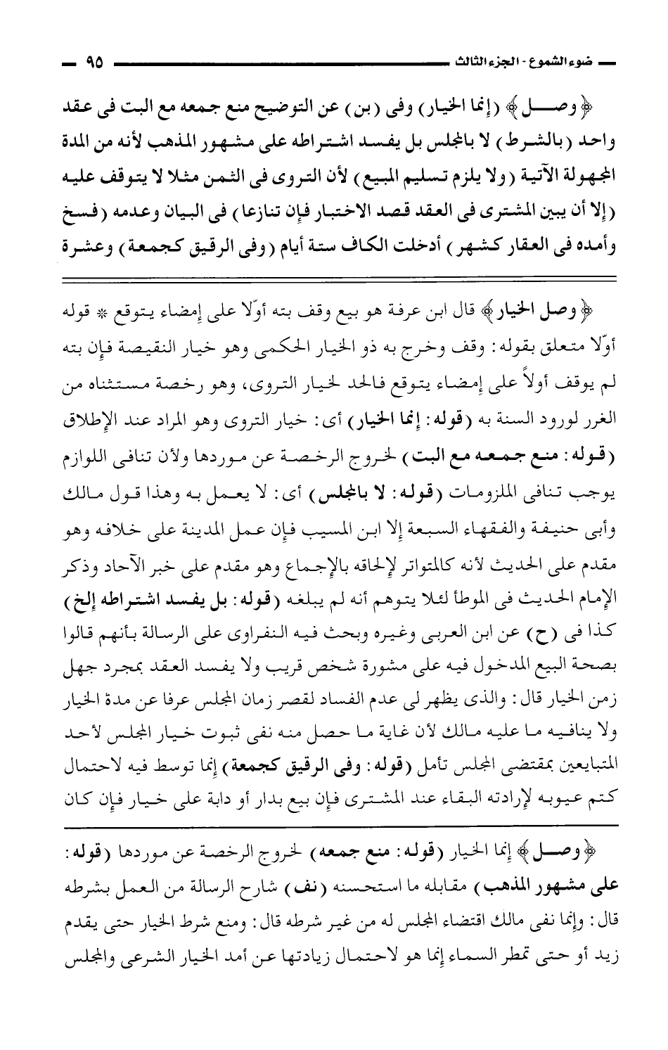 {وصل} إنما الخيار (قوله: منع جمعه) لخروج الرخصة عن موردها (قوله: على مشهور المذهب) مقابله ما استحسنه (نف) شارح الرسالة من العمل بشرطه قال: وإنما نفى مالك اقتضاء المجلس له من غير شرطه قال: ومنع شرط الخيار حتى يقدم زيد أو حتى تمطر السماء غنما هو لاحتمال زيادتها عن أمد الخيار الشرعى والمجلس