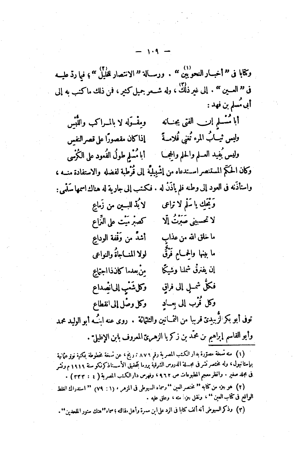 وكتابا فى أخبار النحويين [1]. ورسالة الانتصار للخليل [2]؛ فيما ردّ عليه فى العين. إلى غير ذلك [3]، وله شعر جميل كثير، فمن ذلك ما كتب به إلى أبى مسلم بن فهد: