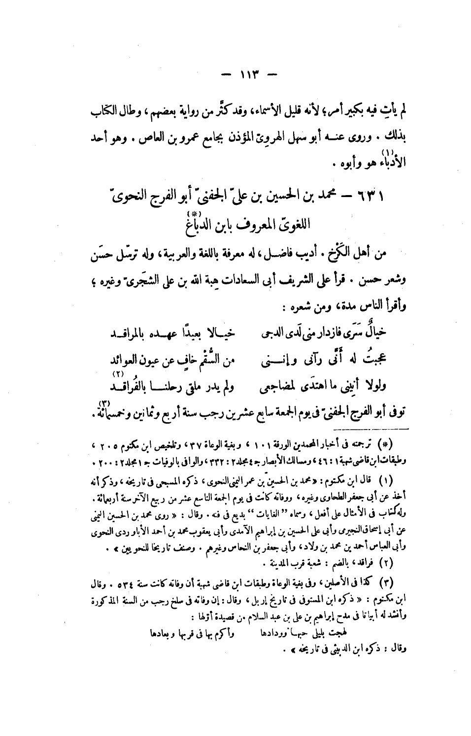 631 - محمد بن الحسين بن علىّ الجفنىّ أبو الفرج النحوىّ اللغوىّ المعروف بابن الدباغ «1»