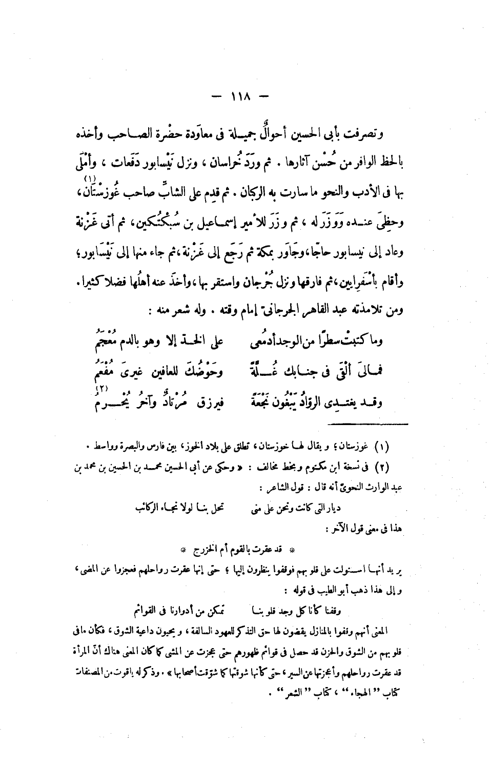 وتصرفت بأبى الحسين أحوال جميلة فى معاودة حضرة الصاحب وأخذه بالحظ الوافر من حسن آثارها. ثم ورد خراسان، ونزل نيسابور دفعات، وأملى بها فى الأدب والنحو ما سارت به الركبان. ثم قدم على الشابّ صاحب غوزستان [1]، وحظى عنده ووزر له، ثم وزر للأمير إسماعيل بن سبكتكين، ثم أتى غزنة وعاد إلى نيسابور حاجّا، وجاور بمكة ثم رجع إلى غزنة، ثم جاء منها إلى نيسابور؛ وأقام بأسفرايين، ثم فارقها ونزل جرجان واستقربها، وأخذ عنه أهلها فضلا كثيرا.