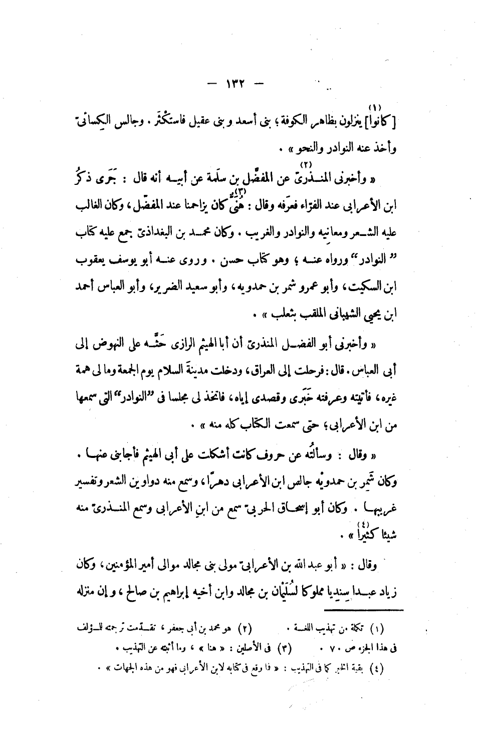 «وأخبرنى أبو الفضل المنذرىّ أن أبا الهيثم الرازى حثّه على النهوض إلى أبى العباس. قال: فرحلت إلى العراق، ودخلت مدينة السلام يوم الجمعة ومالى همة غيره، فأتيته وعرفته خبرى وقصدى إياه، فاتخذ لى مجلسا فى النوادر التى سمعها من ابن الأعرابى؛ حتى سمعت الكتاب كله منه».