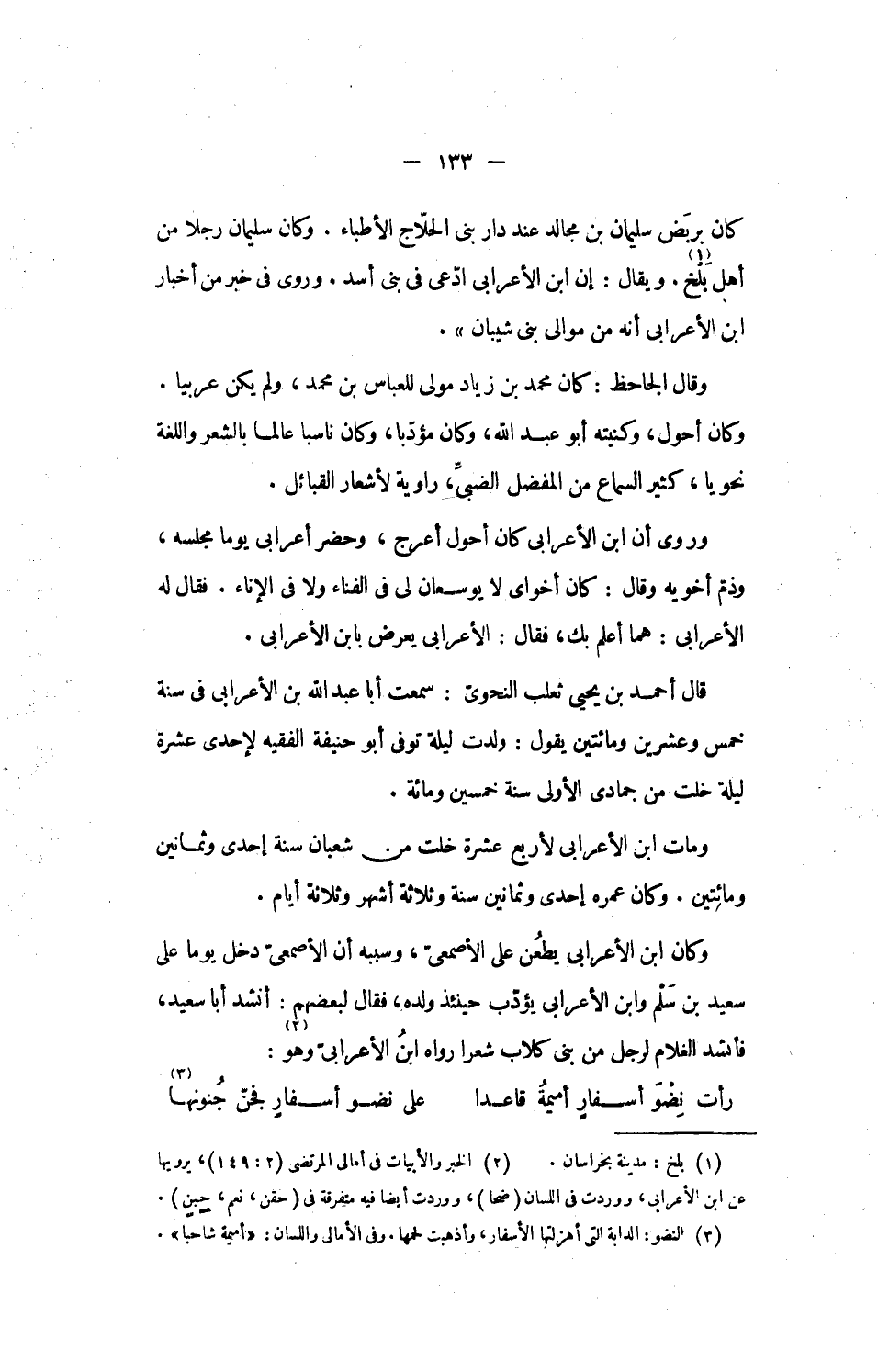 وكان ابن الأعرابى يطعن على الأصمعىّ، وسببه أن الأصمعىّ دخل يوما على سعيد بن سلم وابن الأعرابى يؤدّب حينئذ ولده، فقال لبعضهم: أنشد أبا سعيد، فأنشد الغلام لرجل من بنى كلاب شعرا رواه ابن الأعرابىّ وهو [2]:
